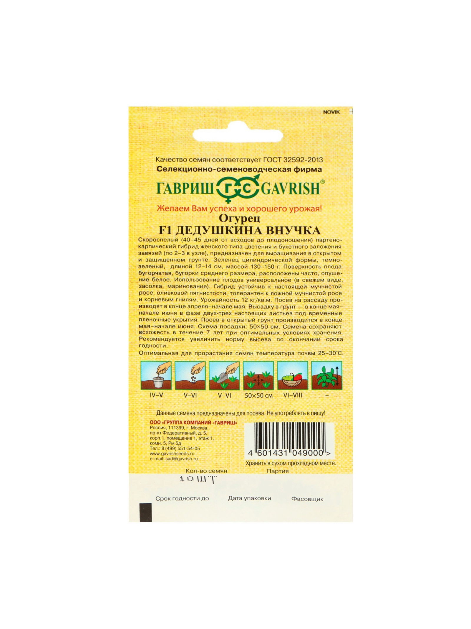 Сроки созревания: Ранний, Ранний ( до 48 дней) Посев (посадка) в грунт: Июнь, Май Посев на рассаду: Апрель, Май Размер упаковки: 8 x 0.2 x 15 см. Ампельные: Да Вьющиеся (лианы): Да Размер: Короткоплодные (от 12 до 18 см) см Размер: Короткоплодные (от 12 до 18 см) см tnved: 1209918000 Применение: Универсальное Тип поверхности: Среднебугорчатый Форма: Цилиндрическая Урожайность, кг с куста: 12 Урожайность, ?2: 12 Упаковка: Цветная Сорт или гибрид: Гибрид F1 Тип: Партенокарпические Место выращивания: Универсальный Сорт: F1 "F1 Дедушкина внучка" это скороспелый партенокарпический гибрид женского типа цветения с букетным заложением завязей, у которого период от всходов до плодоношения составляет 40–45 дней. Устойчив к настоящей мучнистой росе, оливковой пятнистости, толерантен к ложной мучнистой росе и корневым гнилям. Предназначен для выращивания в открытом и защищённом грунте. Зеленец цилиндрической формы тёмной окраски достигает 12–14 см в длину и весит 130–150 гр Поверхность плода имеет часто расположенные бугорки среднего размера, белое опушение. Растение формирует по 2–3 завязи в каждом узле. Используйте огурцы в свежем виде, для засолки и маринования. Посев: на рассаду с конца апреля по начало мая. Оптимальная температура земли для семян 25–30 °C. Помещайте молодые растения в почву с конца мая по начало июня в фазе 2–3 настоящих листьев под временные плёночные укрытия. Проводите посев в открытый грунт с конца мая по начало июня. Схема посадки: 50 x 50 см Урожайность составляет 12 кг/?2. | ||
