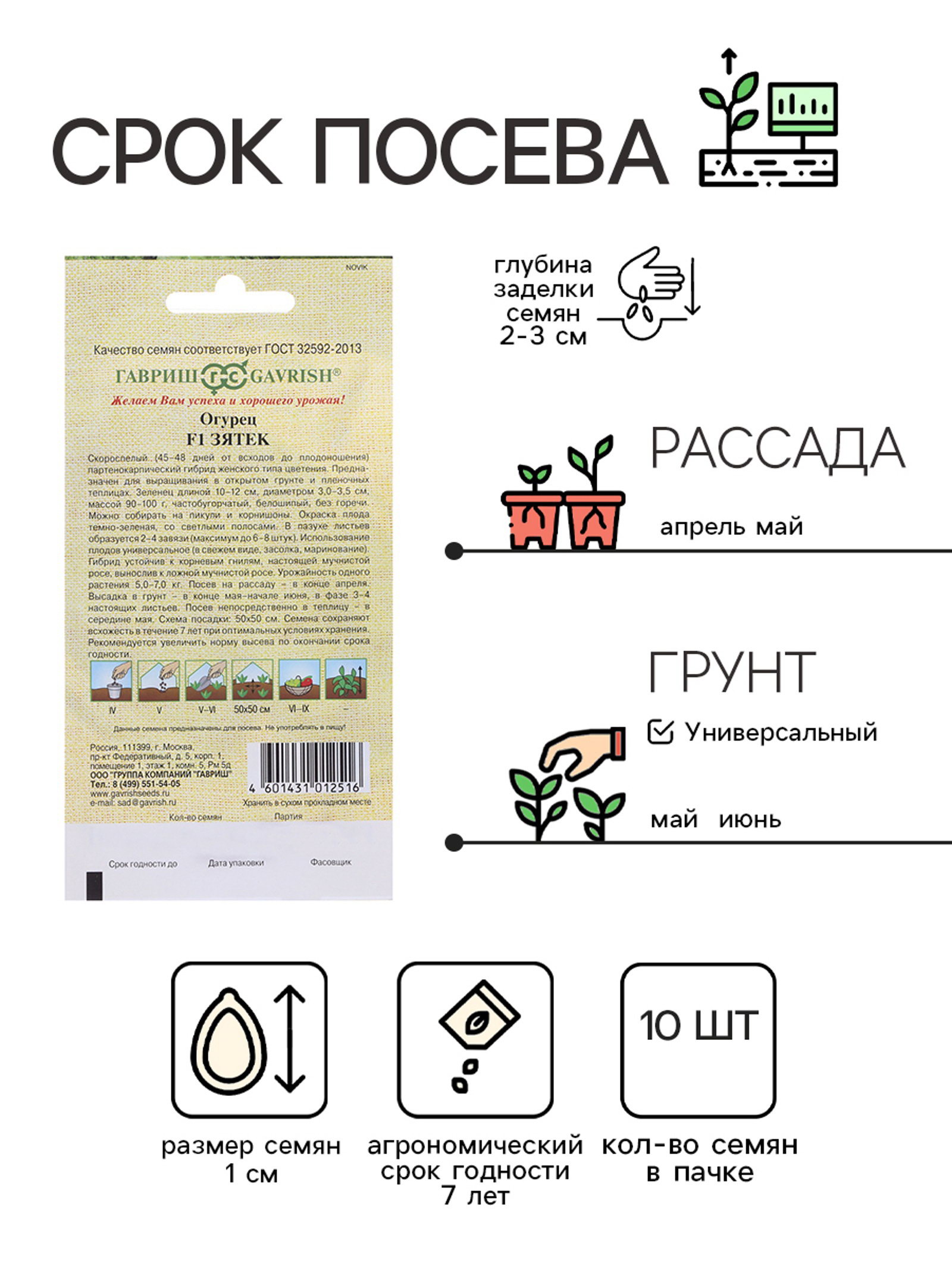 Семена Огурец "Зятек" F1, скороспелый, партенокарпический, 10 шт., Гавриш, Россия