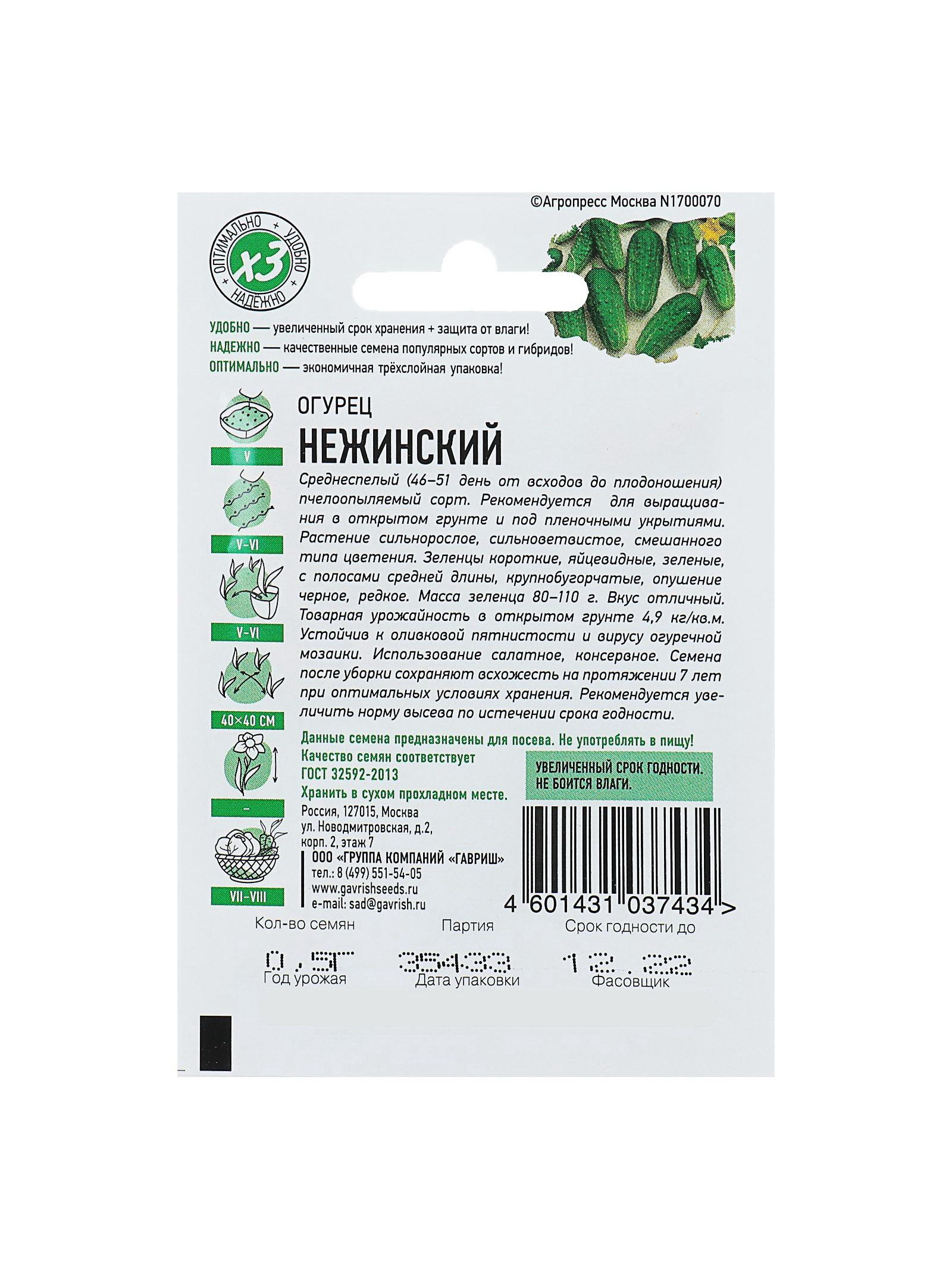 Семена Огурец "Нежинский", раннеспелый, пчелоопыляемый, 0.3 г серия ХИТ х3, Гавриш, Россия