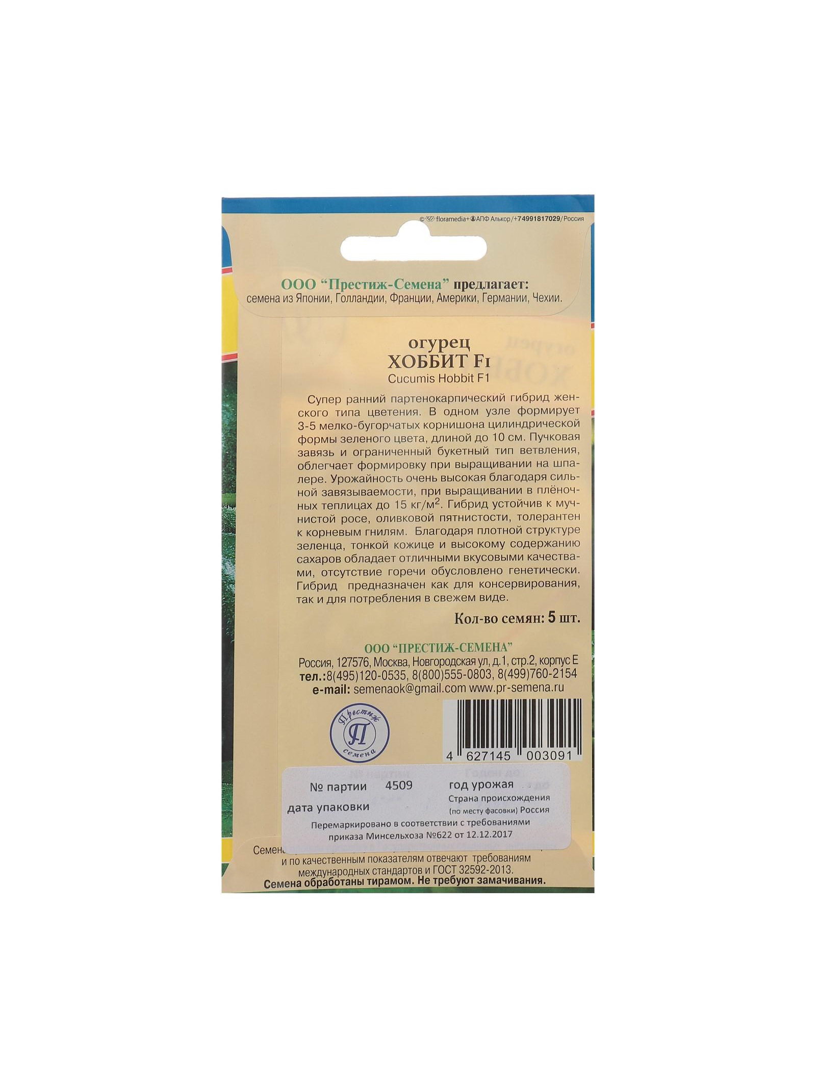 Семена Огурец "Хоббит" F1, раннеспелый, партенокарпический, 5 шт, 8x15x0.1 см., Престиж семена, Россия
