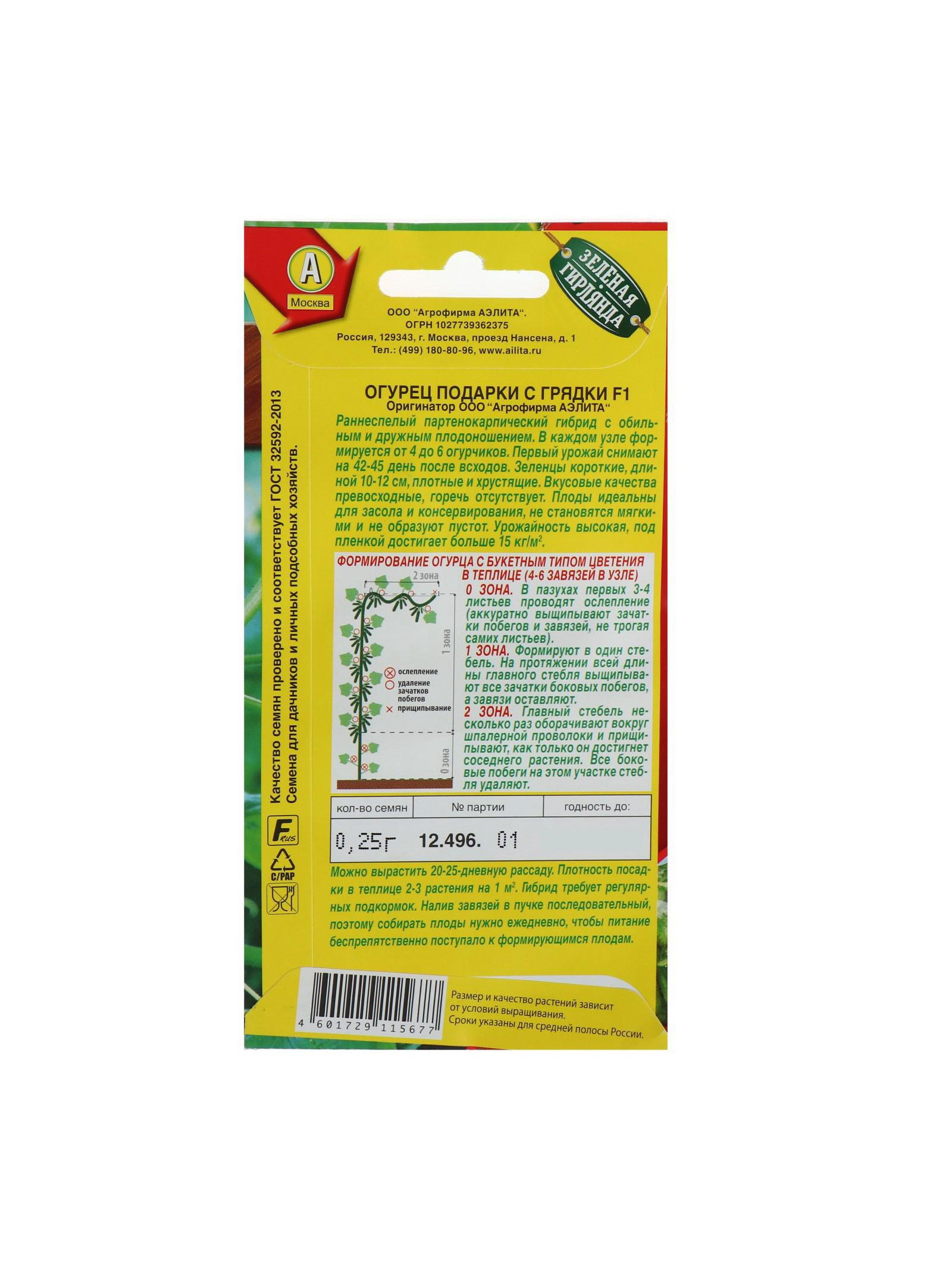 Сроки созревания: Ранний, Ранний ( до 48 дней) Размер упаковки: 8 x 0.2 x 15 см. Ампельные: Да Вьющиеся (лианы): Да Гладкие: Нет Бугорчатые: Да Размер: Корнишоны (до 12 см) см Размер: Корнишоны (до 12 см) см tnved: 1209918000 Упаковка: Цветная Сорт или гибрид: Гибрид F1 Особенности выращивания: Универсальный Вегетационный период, дни: 44 Агрономический срок годности, лет: 7 Вид: Партенокарпические Сорт: F1 Раннеспелый партенокарпический гибрид с обильным и дружным плодоношением. В каждом узле формируется от 4 до 6 огурчиков. Первый урожай снимают на 42-45 день после всходов. Зеленцы короткие, длиной 10-12 см, плотные и хрустящие. Вкусовые качества превосходные, горечь отсутствует. Плоды идеальны для засола и консервирования, не становятся мягкими и не образуют пустот. Урожайность высокая, под пленкой достигает больше 15 кг/м 2 . Посев Посев семян в грунт или на рассаду. Возраст рассады при высадке – 20-30 дней. Плотность посадки 2-3 растения на 1 м2 . В теплицах растения подвязывают к шпалере и формируют в один стебель. Боковые побеги прищипывают над вторым-третьим листом. Растениям необходимы регулярные поливы, прополки, рыхления и подкормки. Сбор плодов нужно проводить регулярно каждые 2-3 дня. | ||