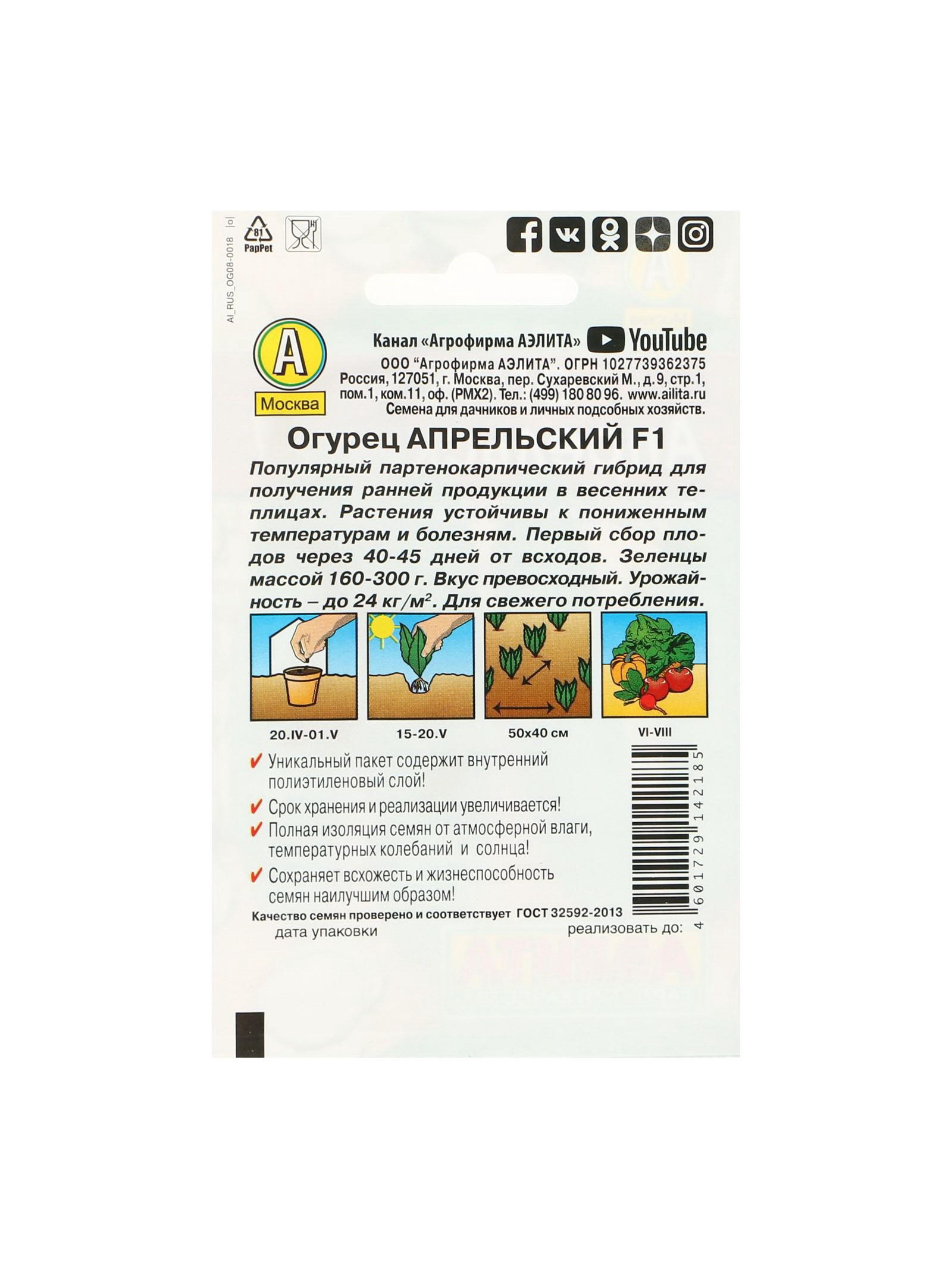 Семена огурца "Апрельский" "Лидер", F1, 10 шт., Агрофирма АЭЛИТА, Китай