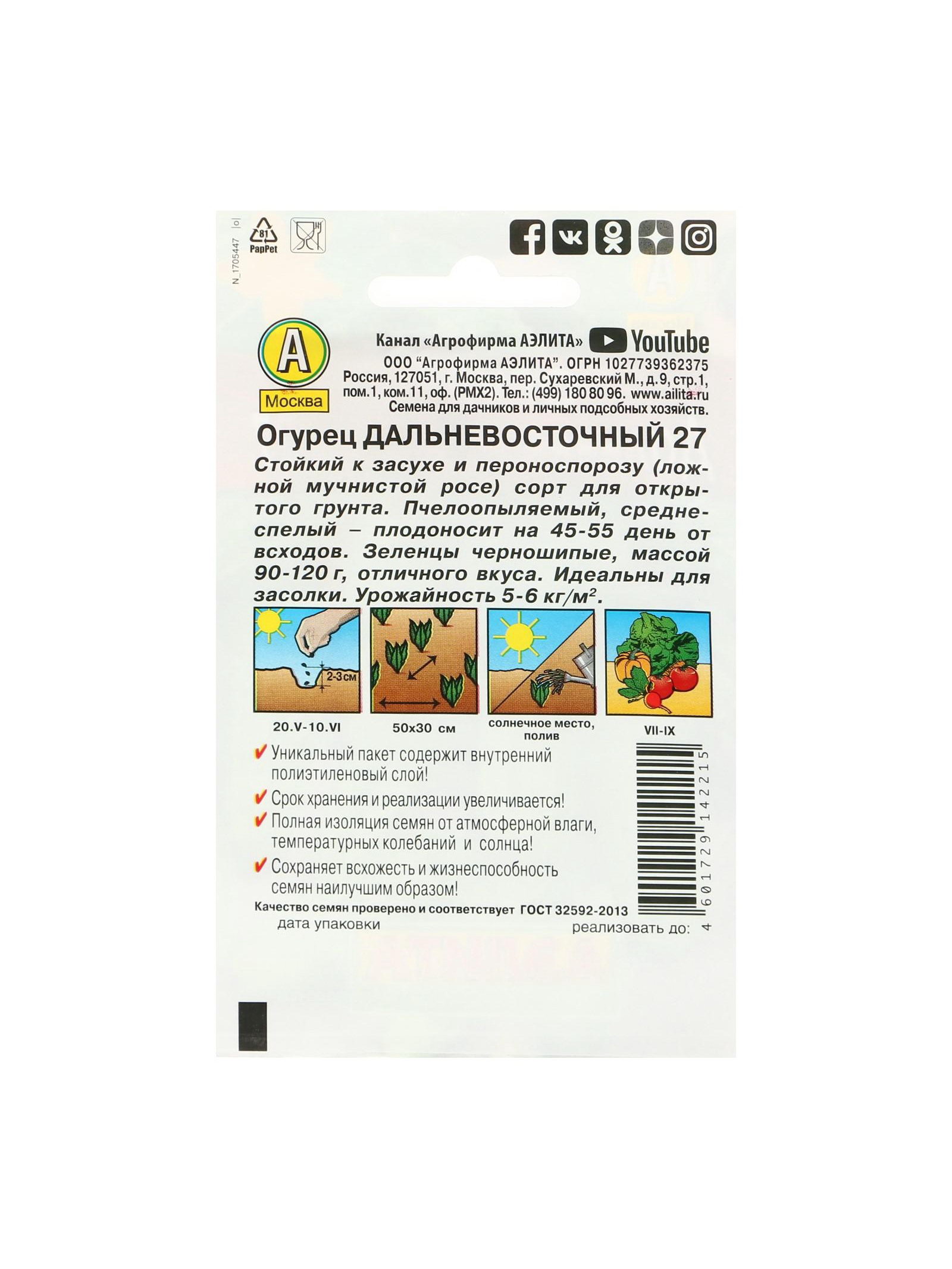Семена огурца "Дальневосточный 27", "Лидер", 20 шт., Агрофирма АЭЛИТА, Нидерланды