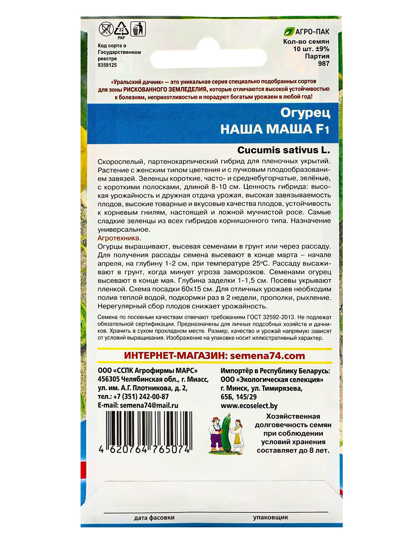 Семена Огурец "Наша Маша" F1 раннеспелый, партенокарпический, 10 шт, Уральский Дачник, Россия