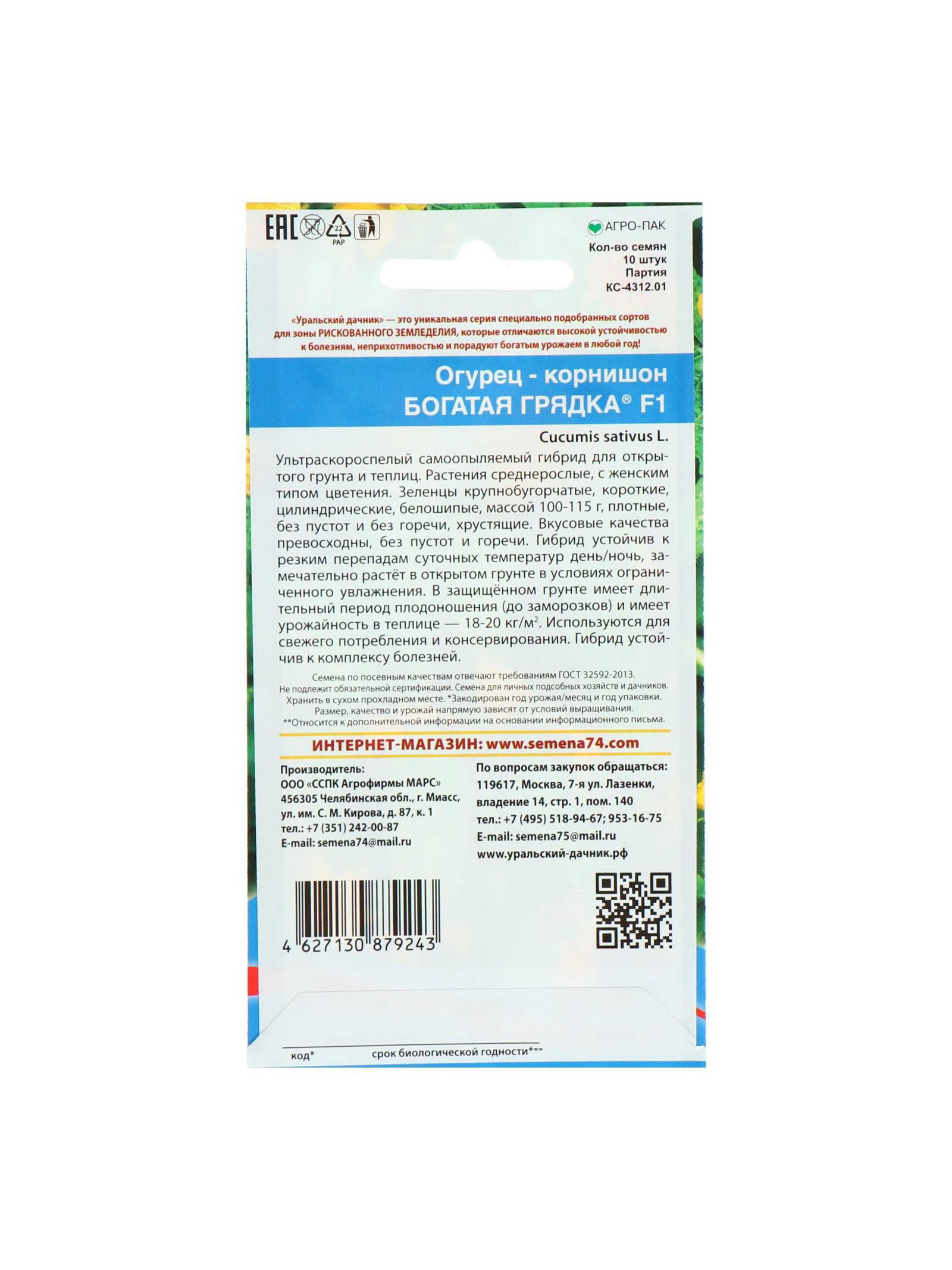 Семена огурца "Богатая грядка", F1, 10 шт., Уральский Дачник, Россия