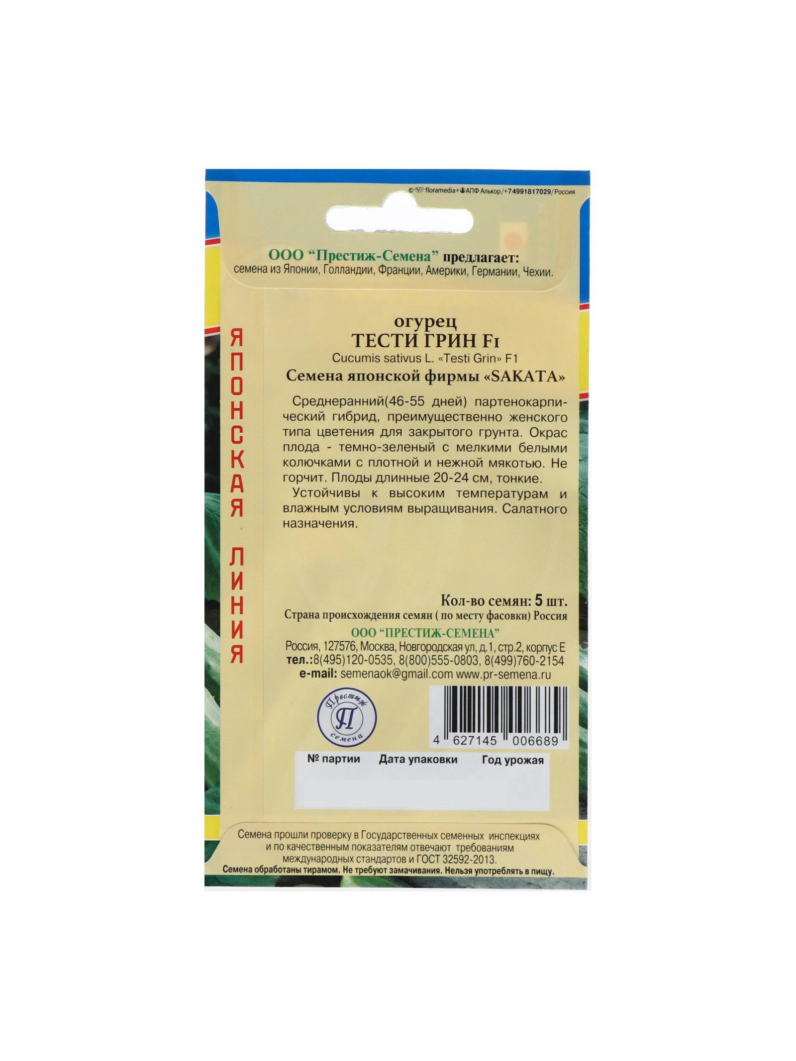 Семена Огурец "Тести Грин" F1, 5 шт, Престиж семена, Россия