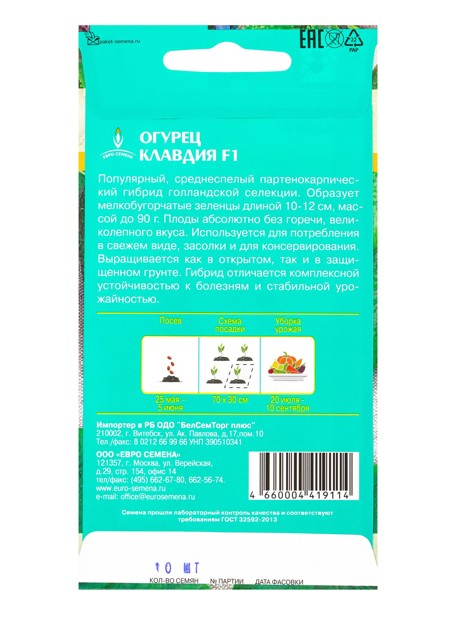 Семена Огурец "Клавдия" F1, 10 шт., Евро-семена, Россия
