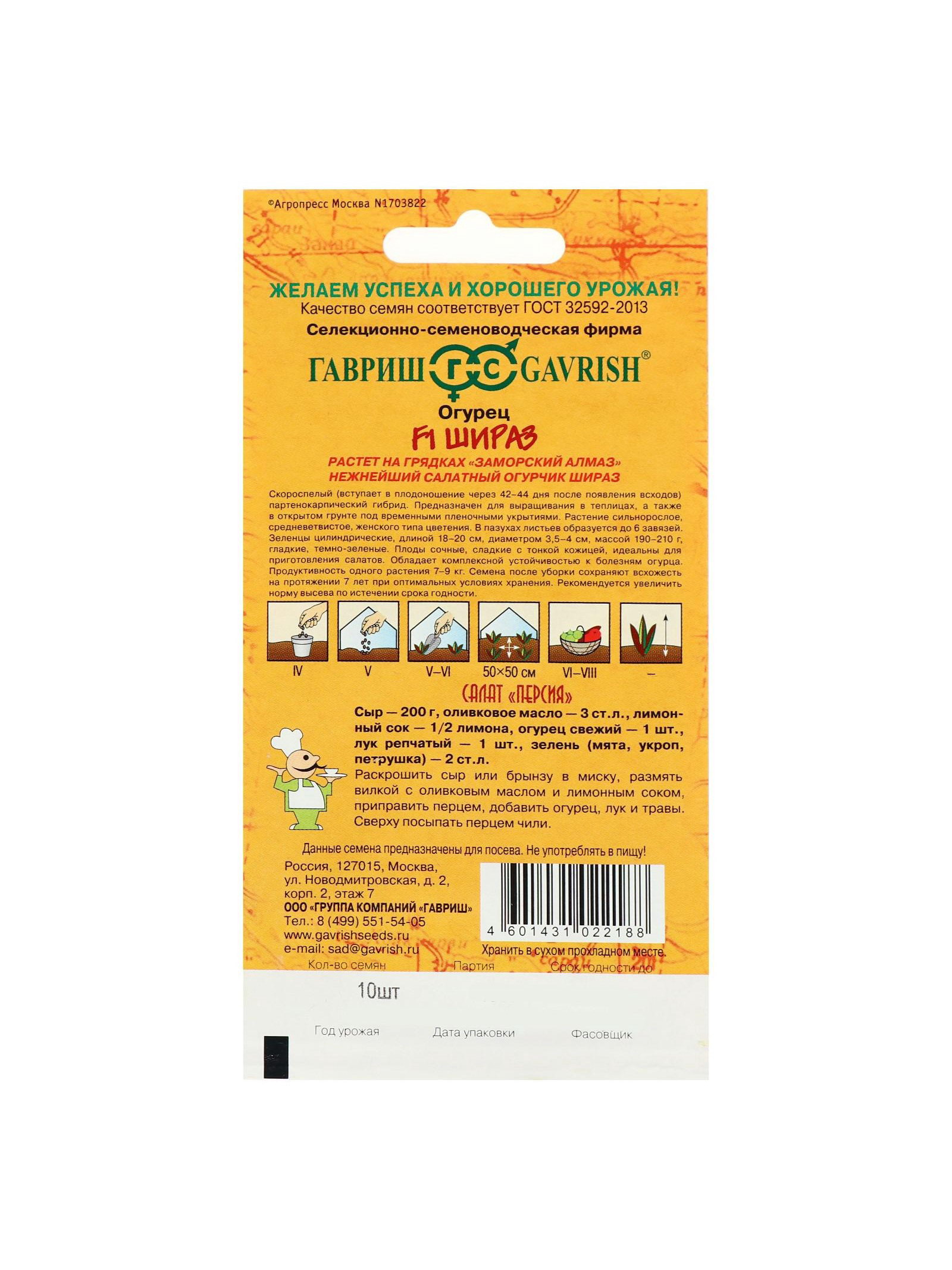 Семена Огурец "Шираз", F1, 10 шт., "География-Гавриш", Гавриш, Россия