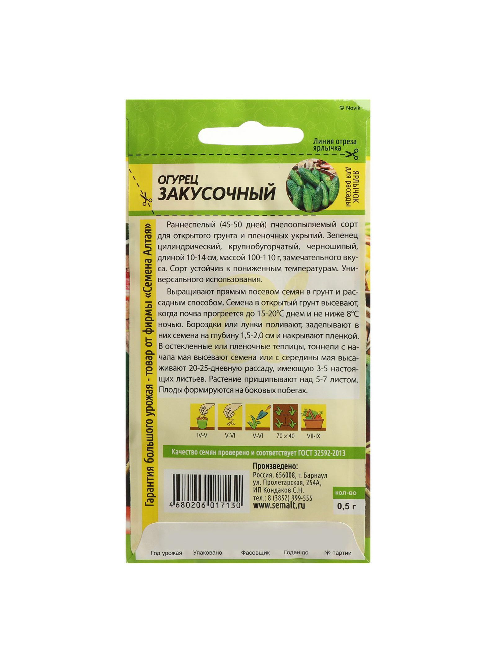 Семена Огурец "Закусочный", Сем. Алт, ц/п, 0.5 г, Семена Алтая, Россия