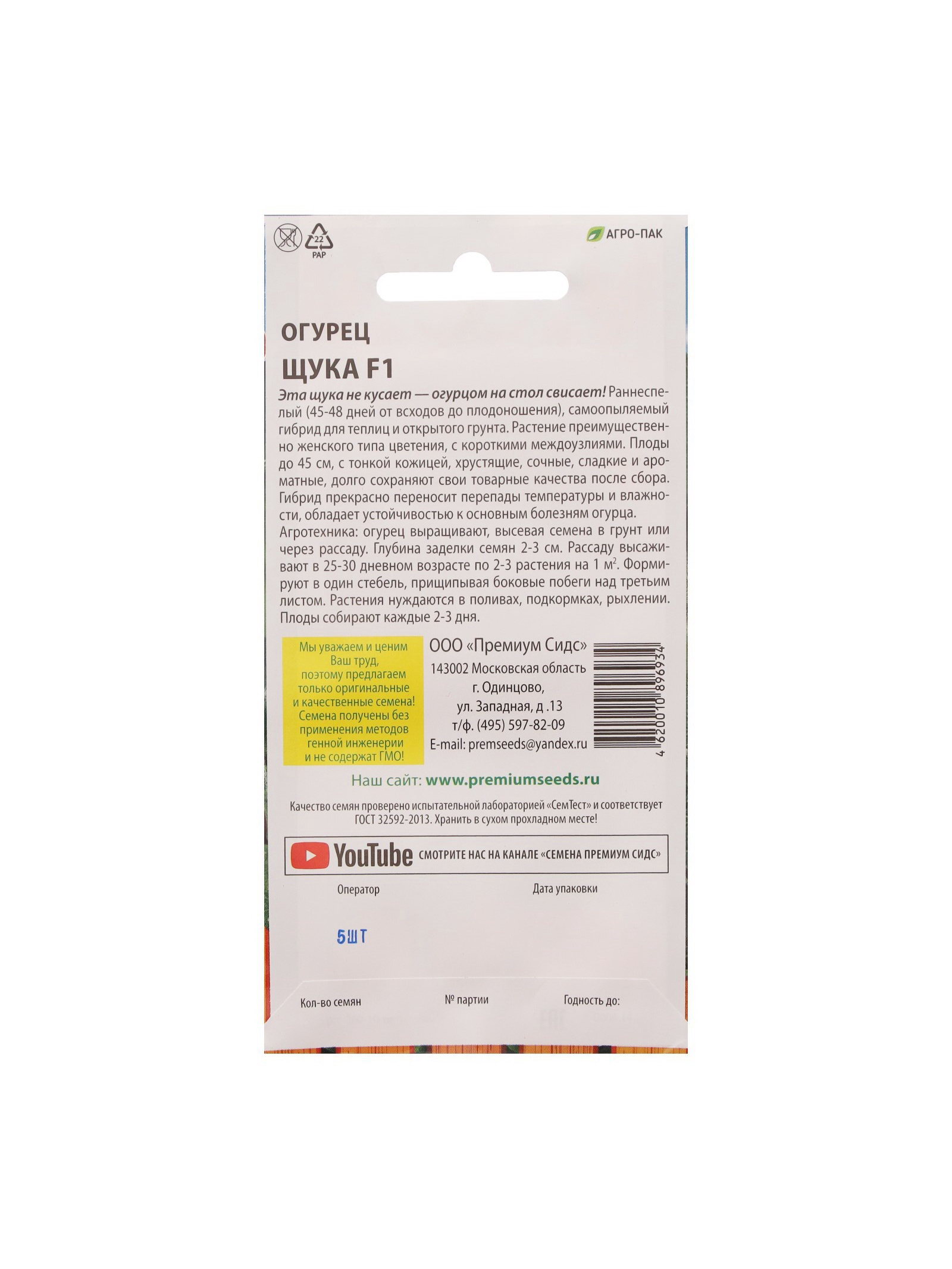 Семена Огурец Щука F1 5 шт., Premium seeds, Россия