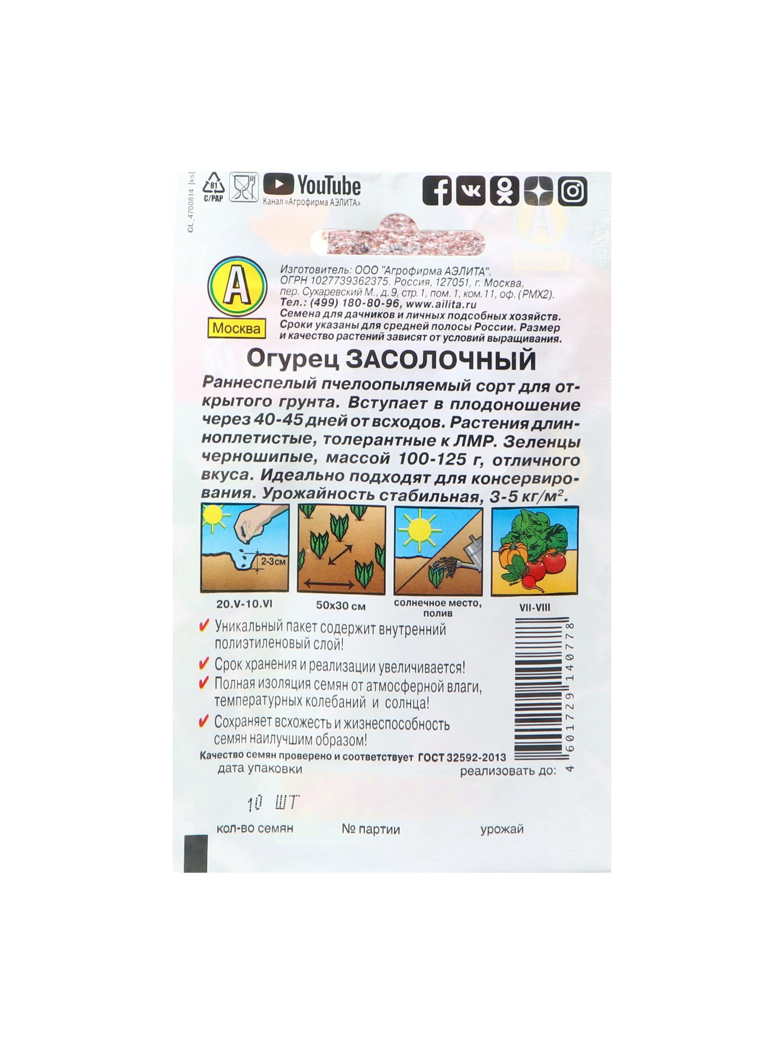 Семена огурца "Засолочный", "Лидер", 10 шт., Агрофирма АЭЛИТА, Нидерланды