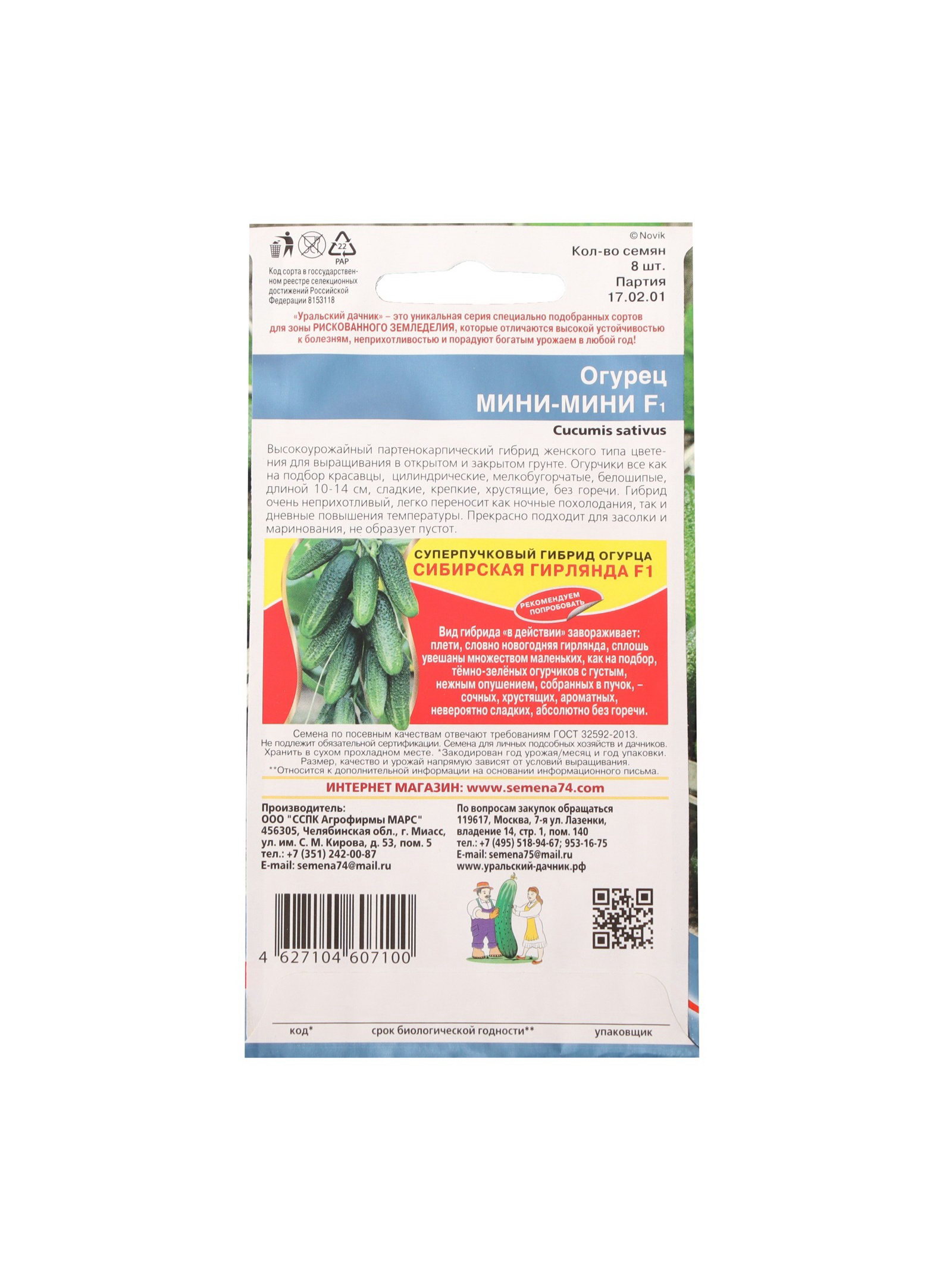 Семена огурец "Мини-мини F1", 8 шт., Уральский Дачник, Россия