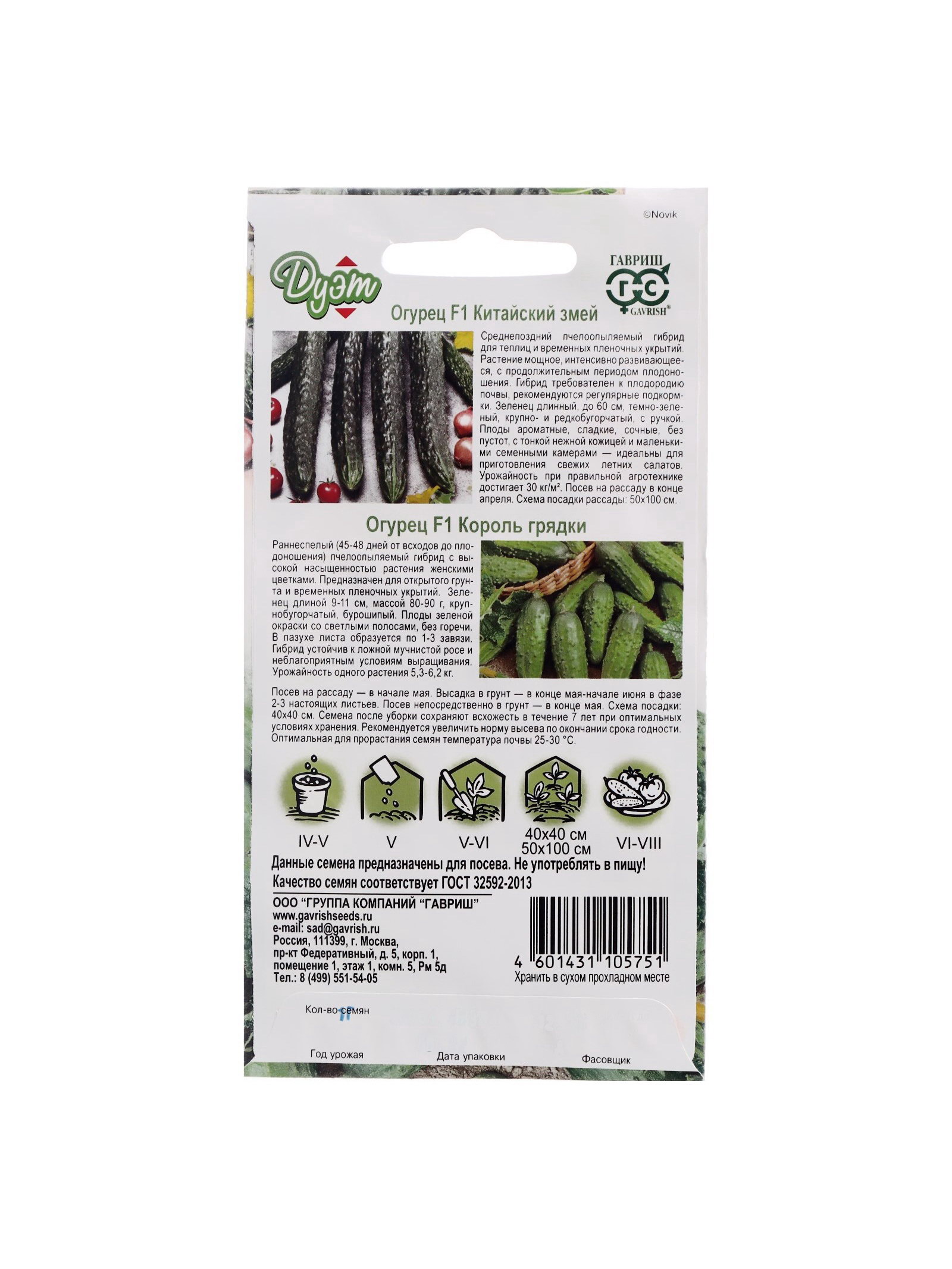 Семена Огурец "Китайский змей" 0.5 г + "Король грядки F1" 0.5 г, серия Дуэт, Гавриш, Россия