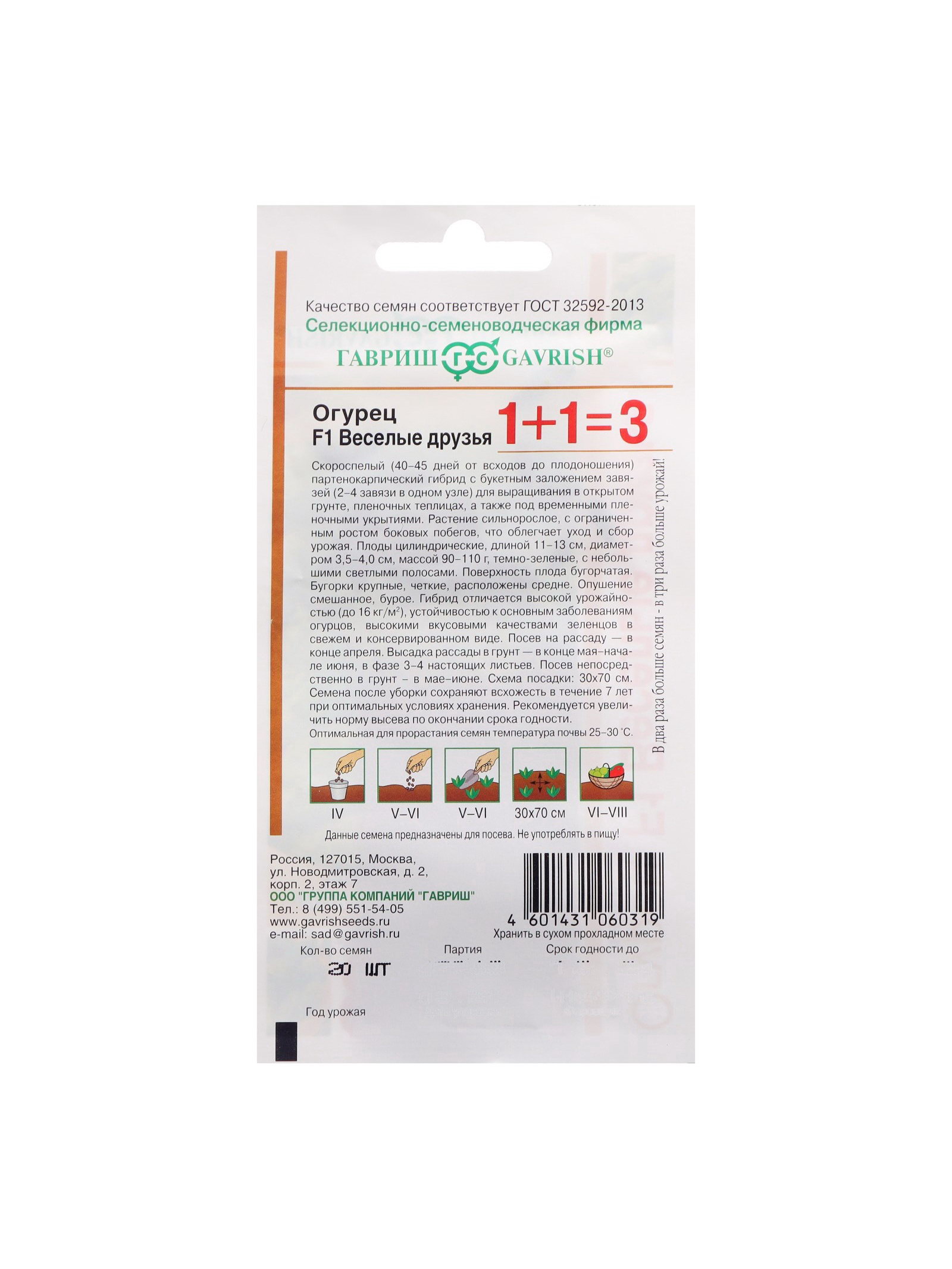 Семена Огурец корнишон "Веселые друзья F1", серия 1+1, 20 шт, Гавриш, Россия