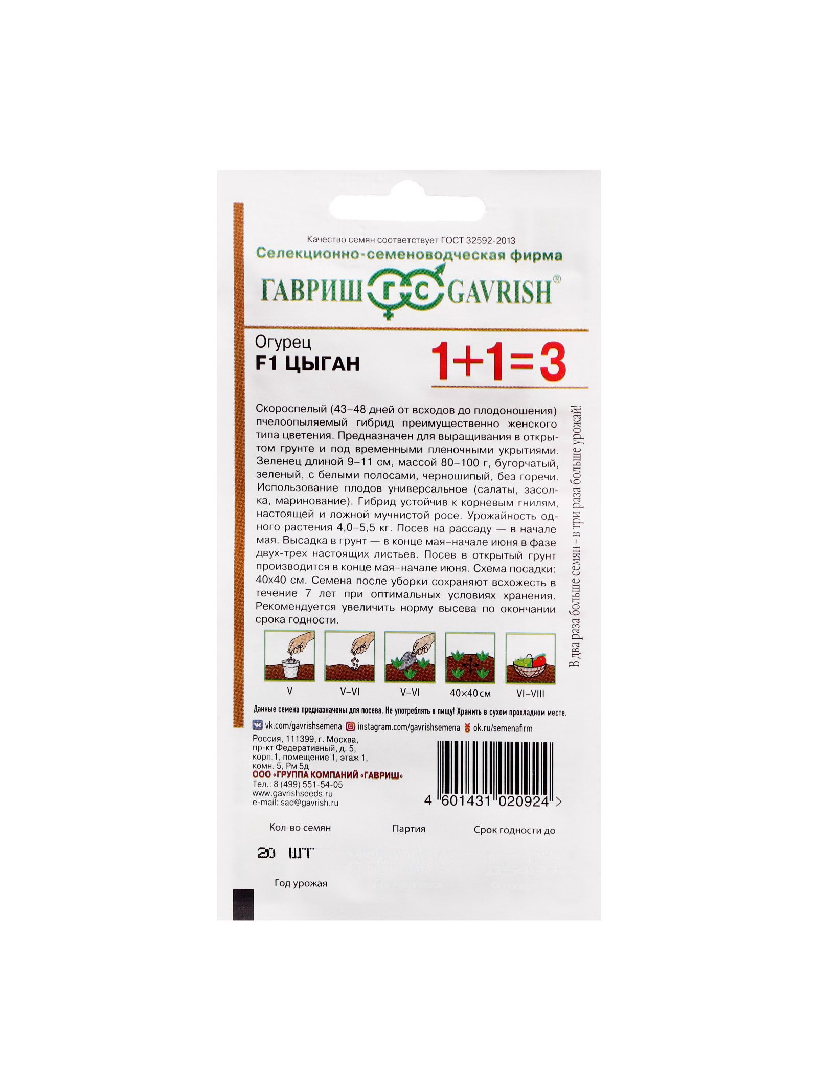 Семена Огурец "Цыган F1", серия 1+1, 20 шт, Гавриш, Россия