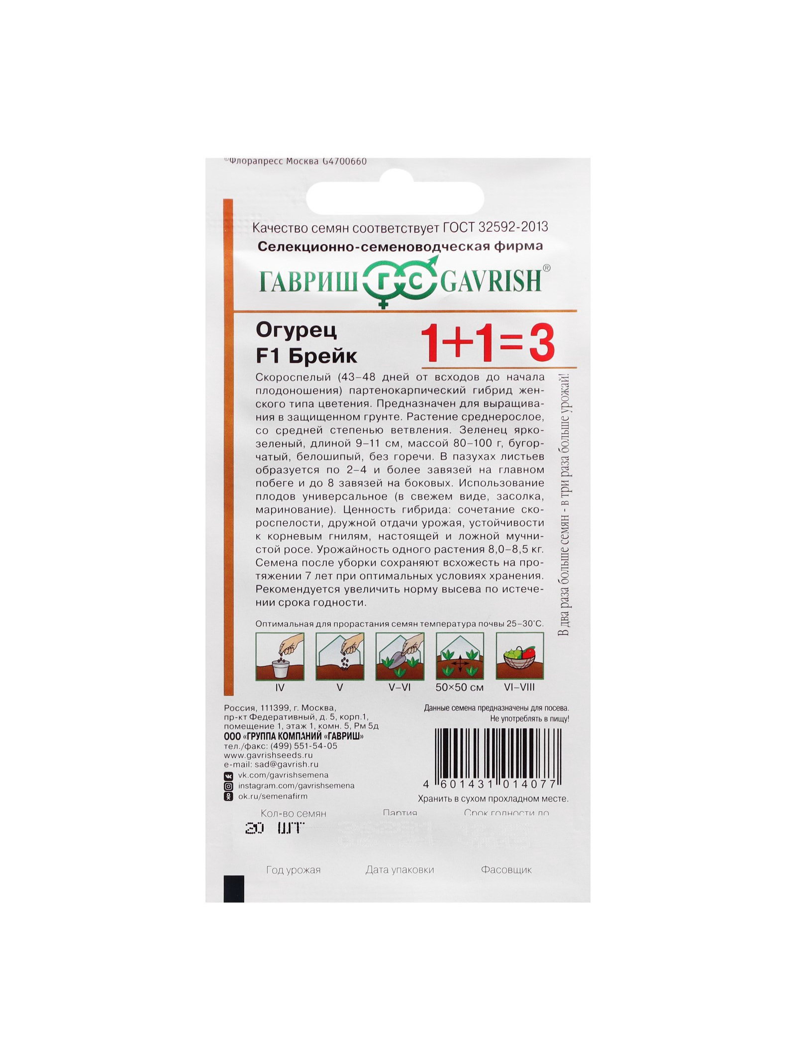 Семена Огурец корнишон "Брейк F1", серия 1+1, 20 шт, Гавриш, Россия