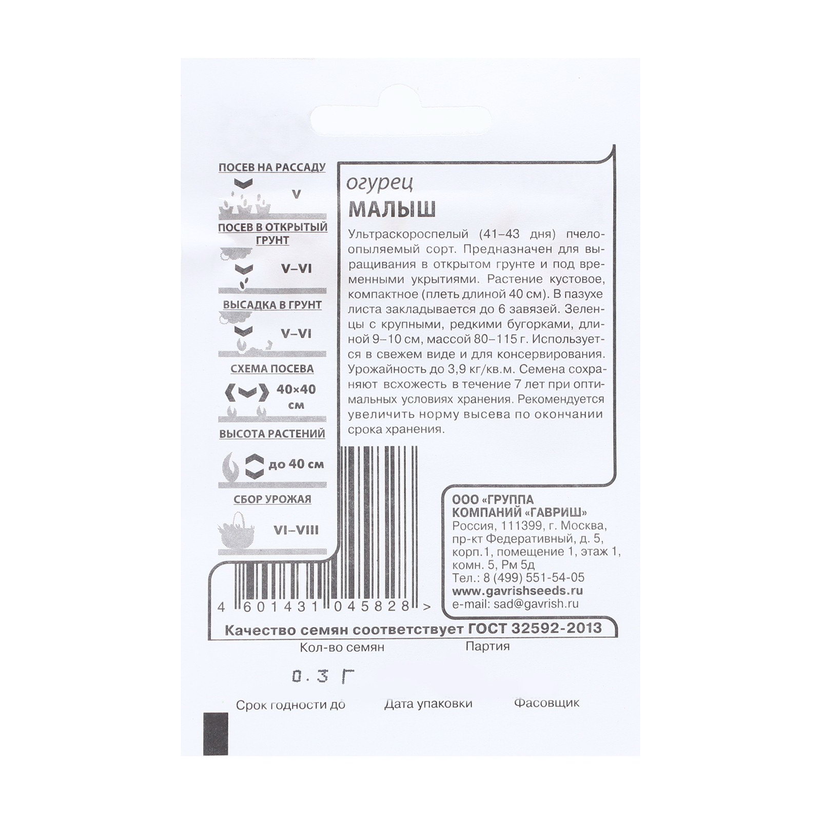 Семена Огурец "Малыш", б/п, 0.3 г, Гавриш, Россия