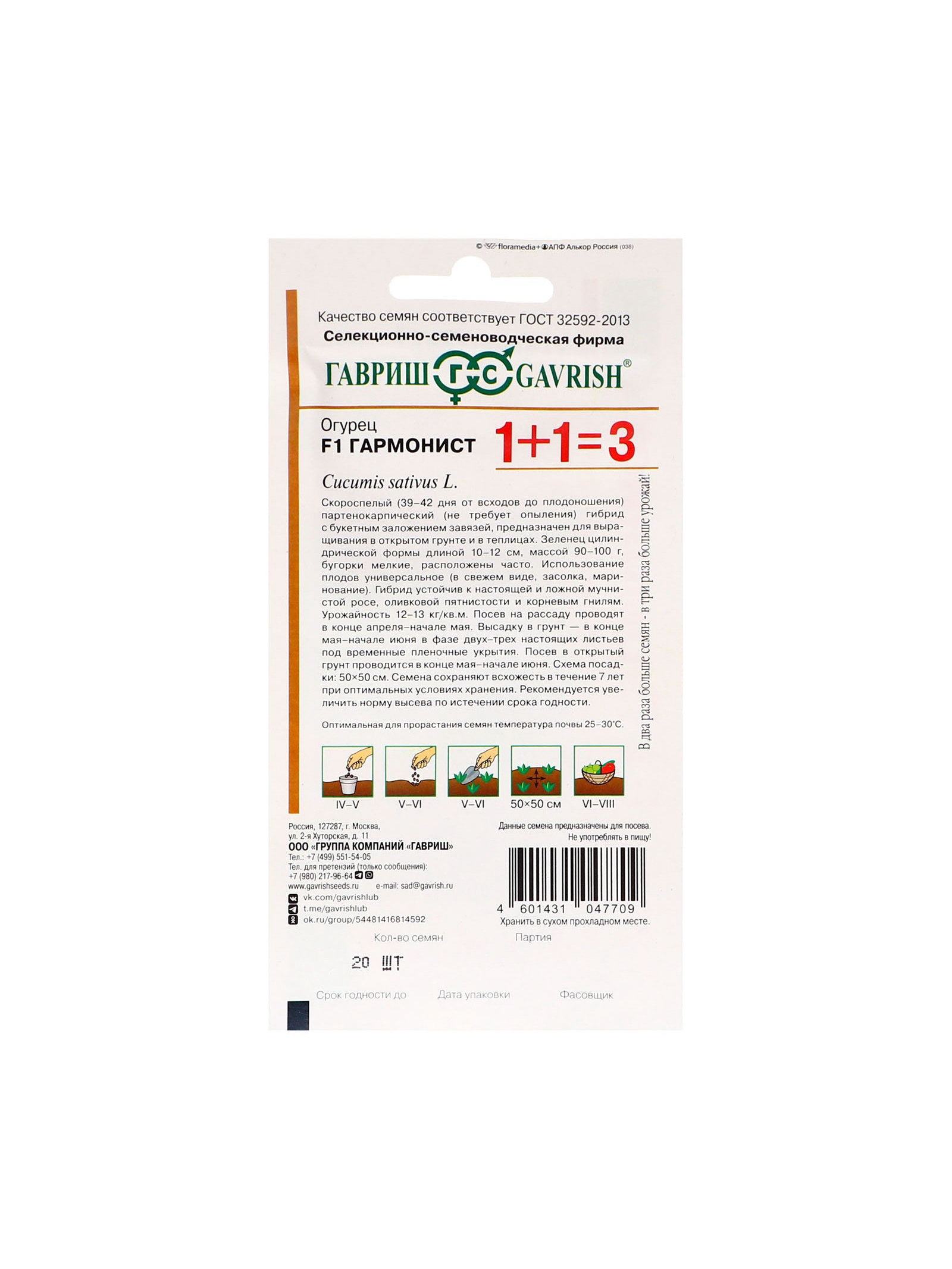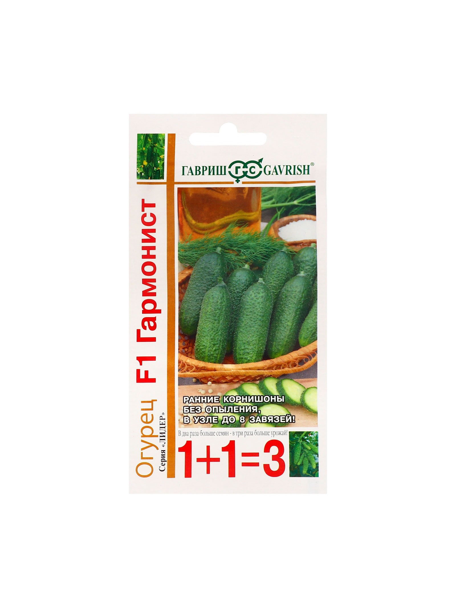 Семена Огурец "Гармонист", F1, корнишон, 20 шт., "1+1", Гавриш, Россия