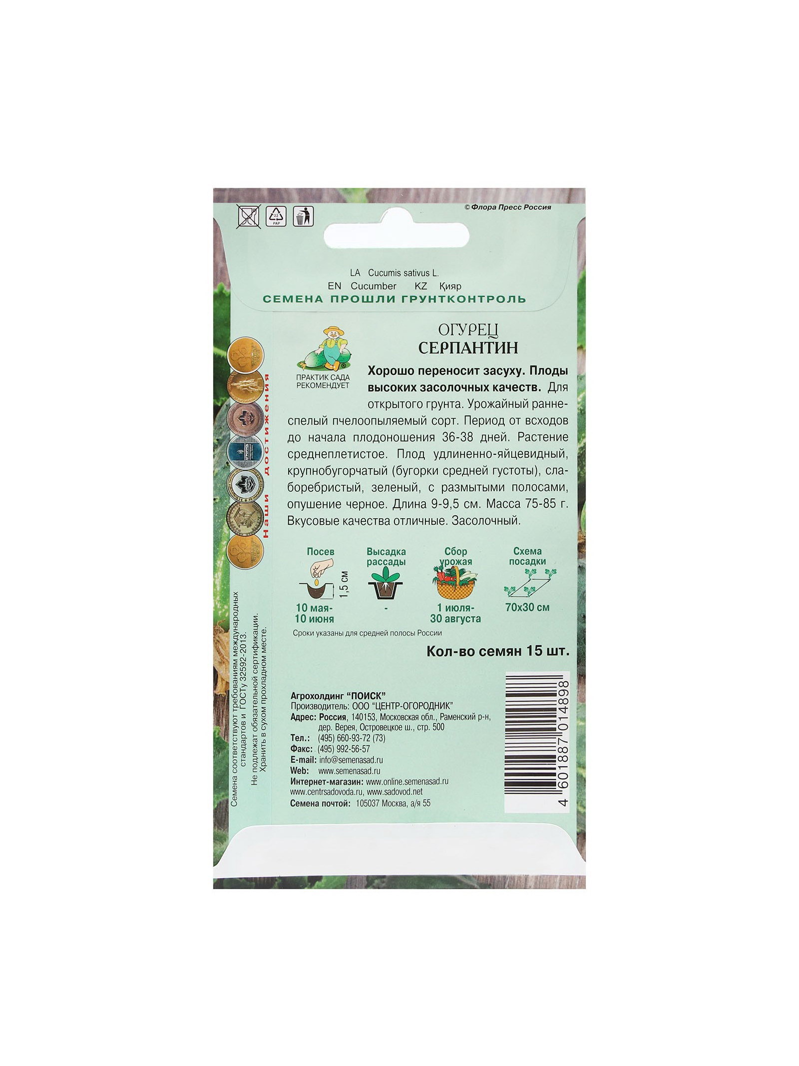 Семена Огурец "Серпантин" 15 шт, ПОИСК, Россия