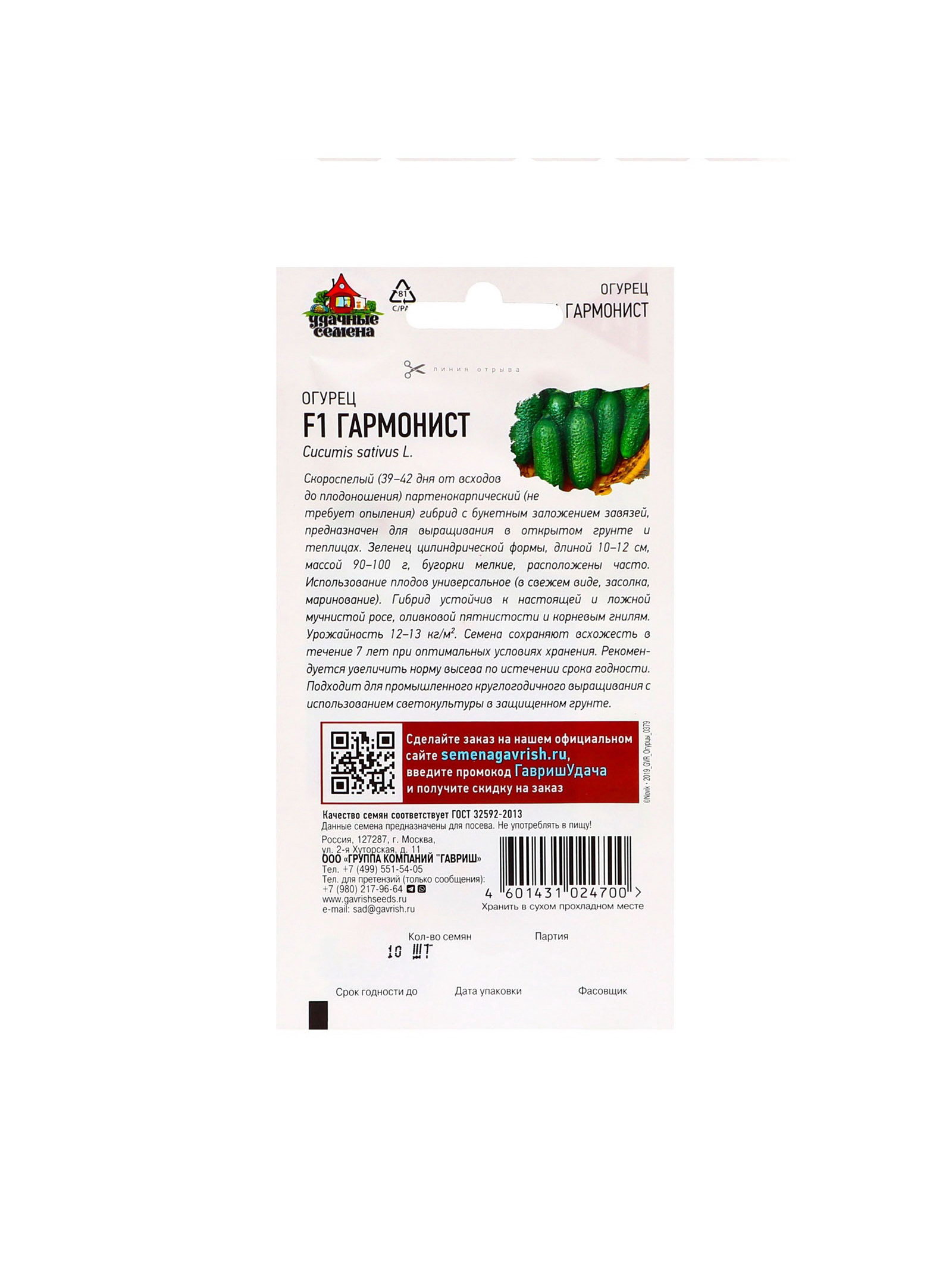 Семена Огурец Гармонист F1 10 шт. Уд. с. корнишон, Гавриш, Россия