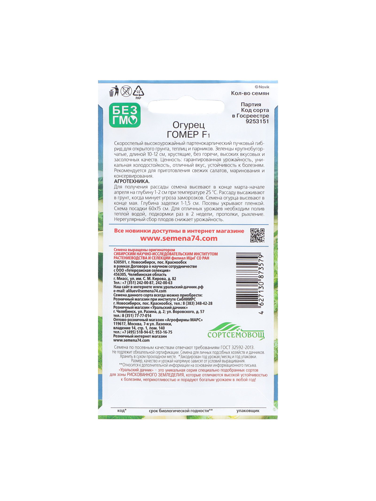 Семена Огурец "Гомер - корнишон", 10 шт, Уральский Дачник, Россия