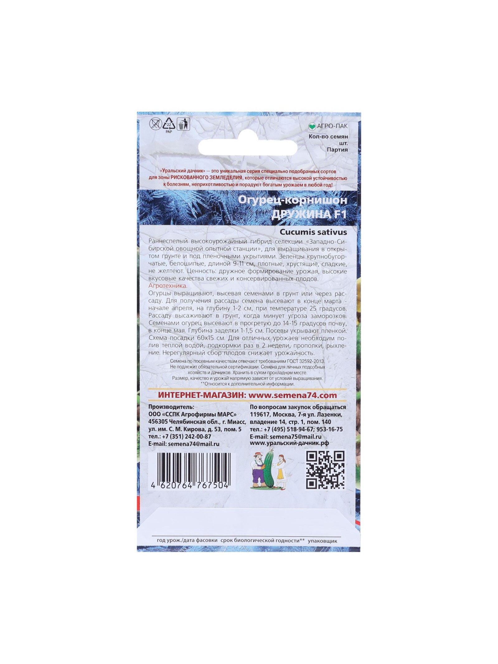 Семена Огурец "Дружина - корнишон", 10 шт, Уральский Дачник, Россия