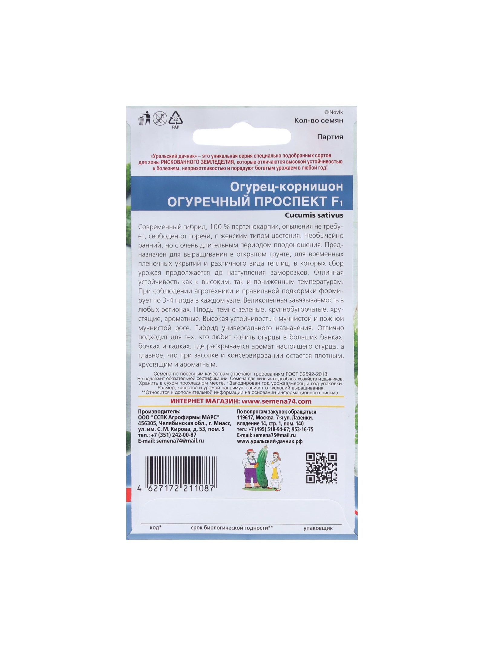 Семена Огурец "Огуречный проспект - корнишон", 8 шт, Уральский Дачник, Россия