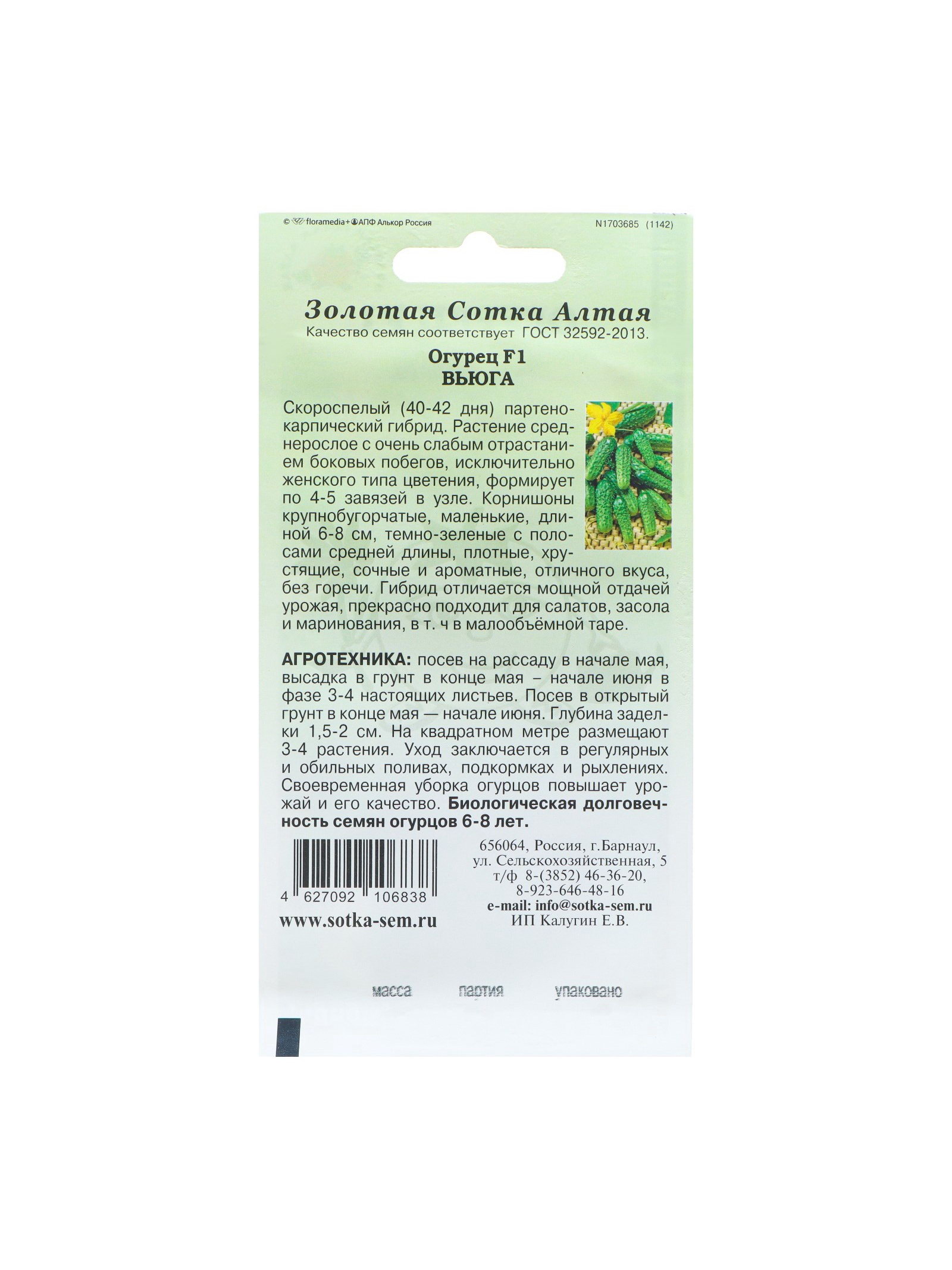 Семена Огурец "Вьюга F1" партенокарпический, 0.15 г, Золотая Сотка Алтая, Россия