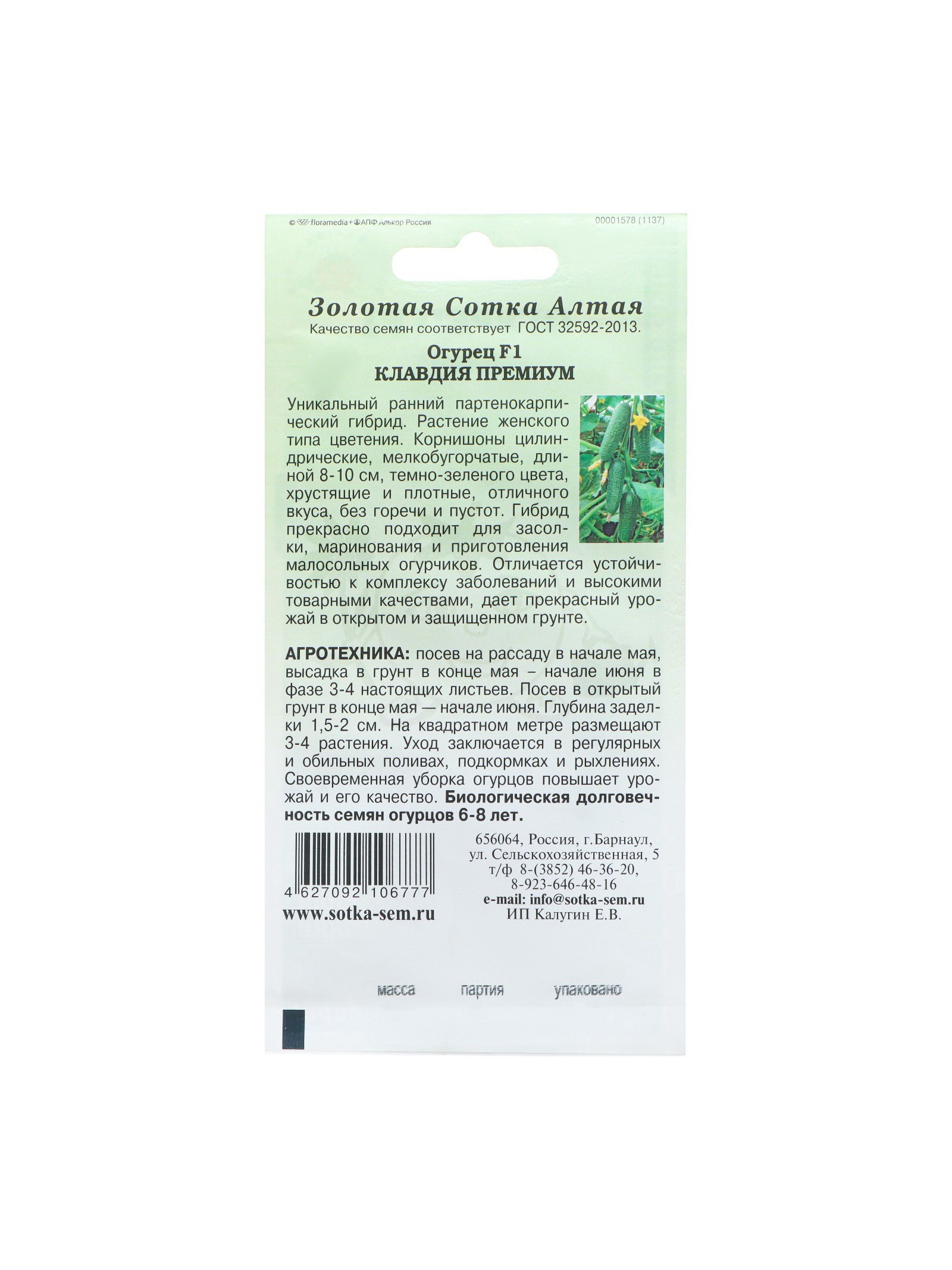 Семена Огурец "Клавдия Премиум F1" партенокарпический, 0.15 г, Золотая Сотка Алтая, Россия