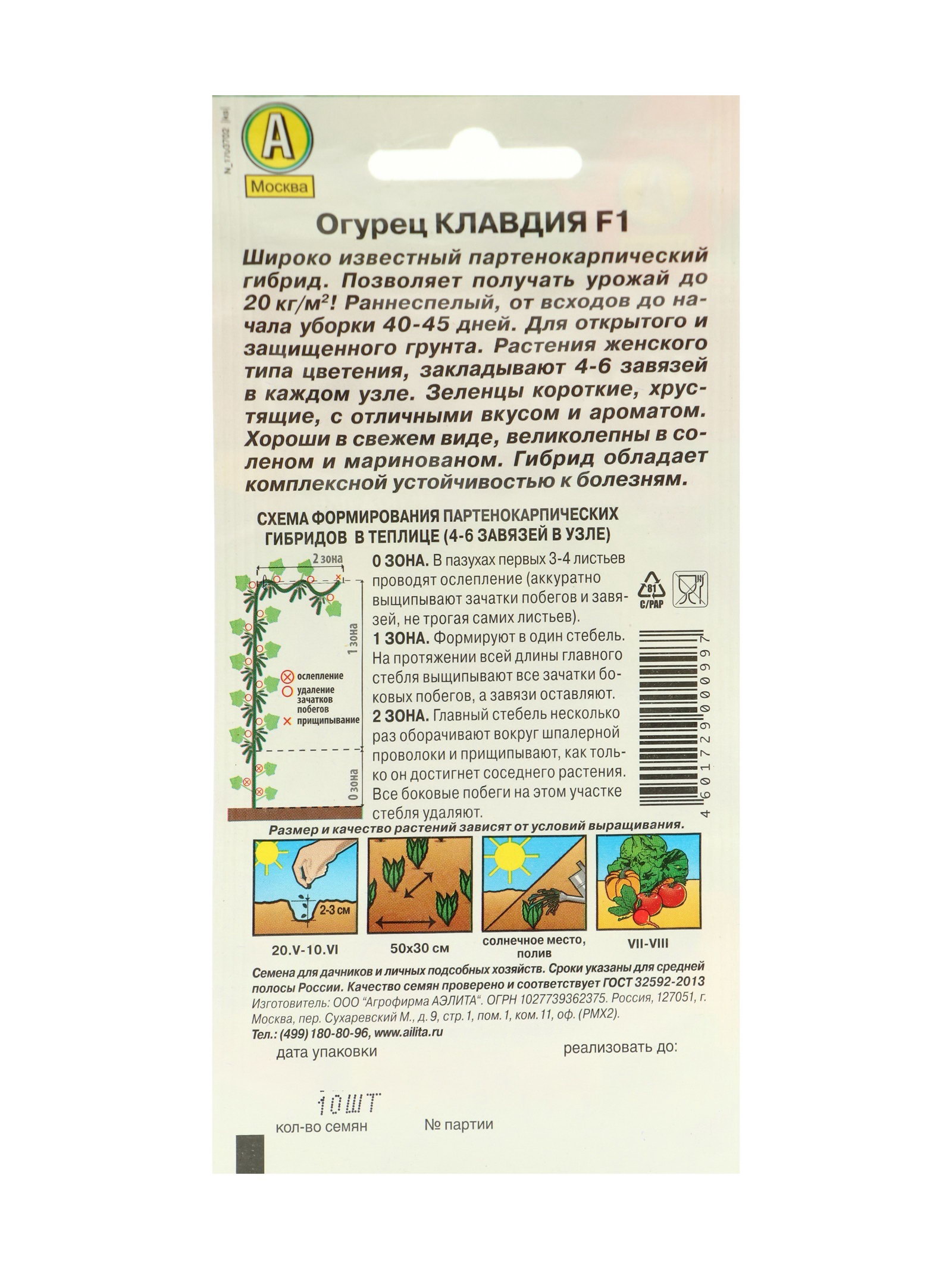 Размер упаковки: 11.5 x 1 x 19 см. Место выращивания: Открытый грунт Тип: Партенокарпические Размер: Корнишоны (до 12 см) см Сорт или гибрид: Гибрид F1 Сроки созревания: Ранний ( до 48 дней) tnved: 1209918000 tnved: 1209918000 Скороспелый партенокарпический гибрид "Клавдия" образует множество цилиндрических бугорчатых огурцов длиной 10–12 см и массой 65–80 гр Сорт отличается стабильной урожайностью, дружной отдачей и комплексной устойчивостью к болезням. h2>Посев h2>На глубину 1,5–2 см при +25 ℃. Затем температуру понижают до 20 ?С. Семена высевают в грунт в конце мая, когда минует угроза заморозков. Плотность посадки 3–4 растения на 1 м su2 su. h2>Уход h2>Требуются своевременные поливы и подкормки. | ||
