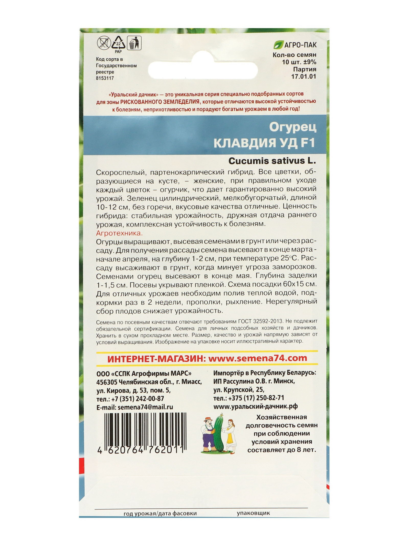 Место выращивания: Закрытый грунт (теплицы, укрытия), Открытый грунт Размер упаковки: 11.5 x 1 x 19 см. Размер упаковки: 11.5 x 1 x 19 см. tnved: 1209918000 Скороспелый партенокарпический гибрид "Клавдия" даёт гарантированно высокий урожай. Цилиндрический бугорчатый зеленец длиной 10–12 см и массой 65–80 г имеет отличные вкусовые качества и не горчит. Ценность сорта: стабильная урожайность, дружная отдача, комплексная устойчивость к болезням. Посев: в грунт в конце мая при температуре почвы выше 13 ℃ и воздуха выше 15 ℃. Плотность посадки 3–4 растения на 1 ?2. Уход: своевременный полив и подкормка. | ||