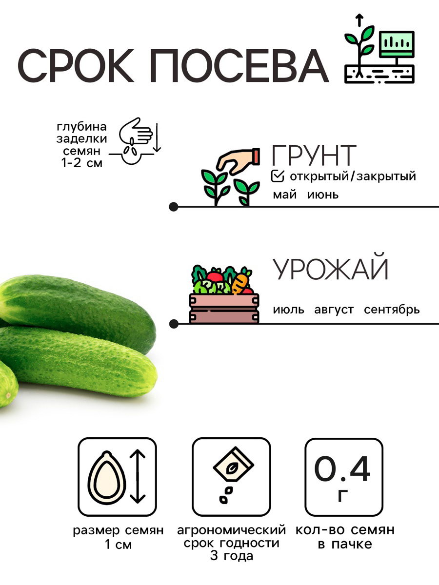 Размер упаковки: 8 x 0.2 x 15 см. Агрономический срок годности, лет: 7 Вид: Семечки Размер: Корнишоны (до 12 см) см Сорт или гибрид: Сорт Бугорчатые: Да Гладкие: Нет Гладкие: Нет tnved: 1209918000 Описание семян огурца "Коротышка" -Сорт: Коротышка -Вес: 0,4 г Характеристика: -Тип: Огурец -Форма плодов: Короткие, цилиндрические -Длина плодов: 8-10 см Особенности: Раннеспелый сорт, время от всходов до уборки составляет 40-50 дней. Плоды имеют хрустящую текстуру и отличный вкус. Устойчив к болезням, таким как мучнистая роса. Рекомендации по выращиванию: Посев семян рекомендуется проводить в теплицу или на открытый грунт после окончания заморозков. Растения предпочитают солнечные участки и плодородные, хорошо дренированные почвы. Регулярный полив и удобрение способствуют обильному плодоношению. Применение: Идеально подходит для свежих салатов и консервирования. Плоды можно использовать в кулинарии для приготовления закусок. Огурец "Коротышка" станет отличным выбором для вашего огорода, обеспечивая ранний и вкусный урожай! Советы при посеве | ||