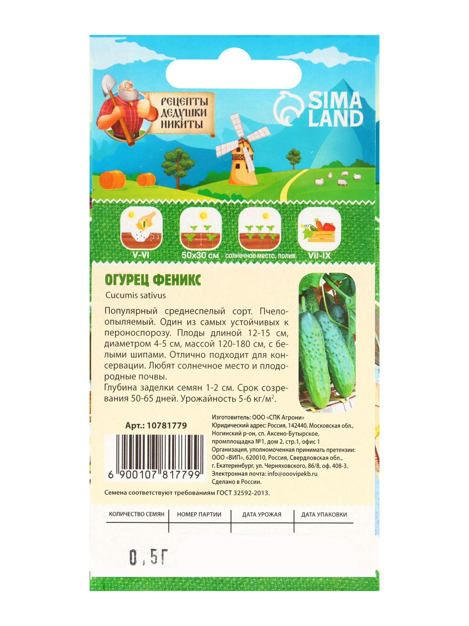 Семена Огурец "Феникс", пчелоопыляемый, среднеспелый, 0.5 г, 7x15x1 см., Рецепты дедушки Никиты, Россия