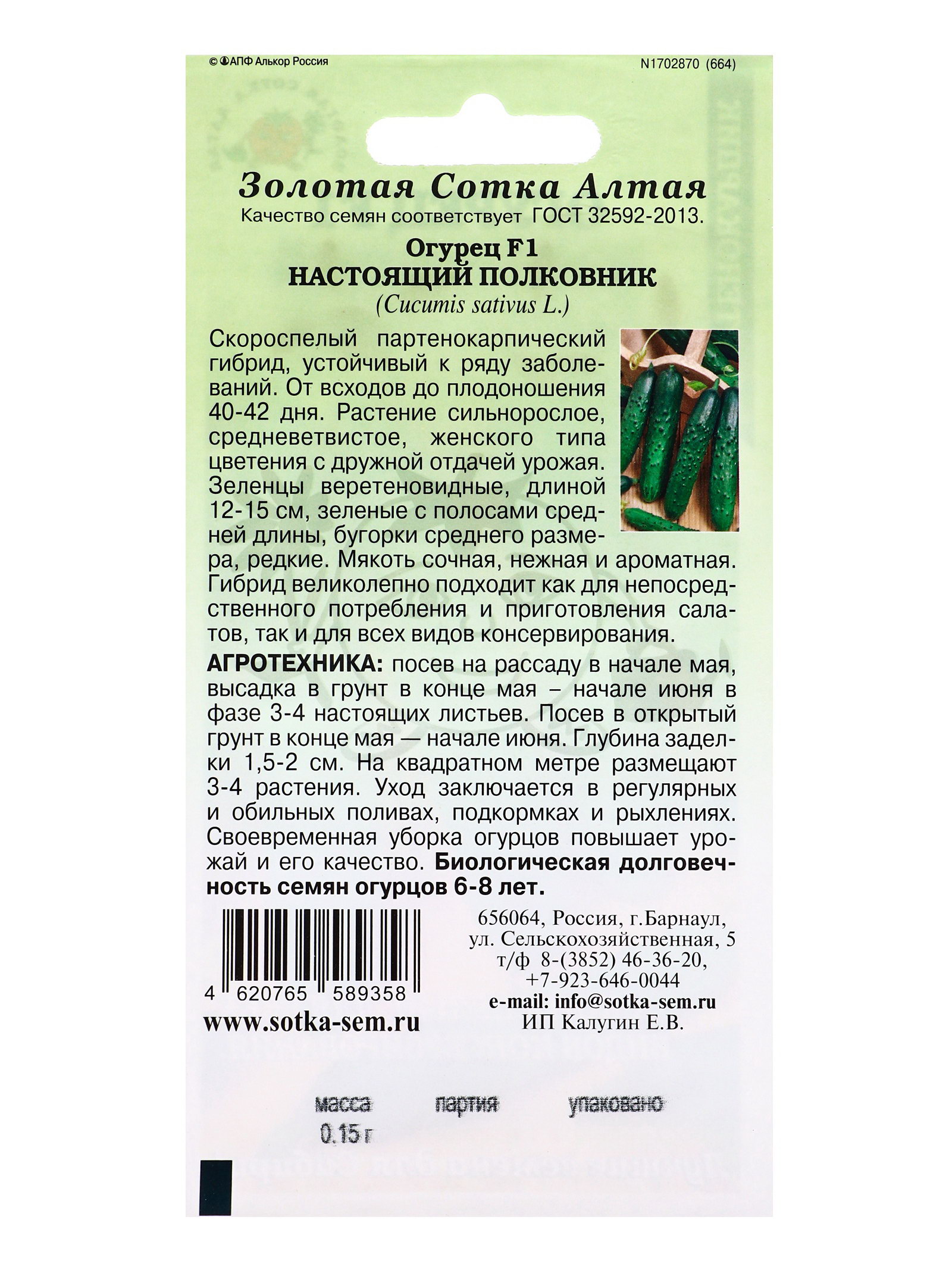 Семена Огурец "Настоящий полковник", F1, 0.15 г, партенокарпический, раннеспелый, "Золотая сотка Алтая", Золотая Сотка Алтая, Россия
