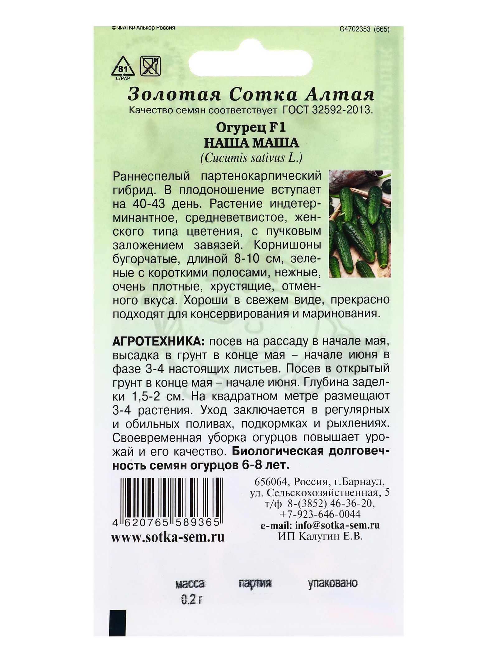 Семена Огурец "Наша Маша", F1, 0.2 г, партенокарпический, раннеспелый, Золотая Сотка Алтая, Россия