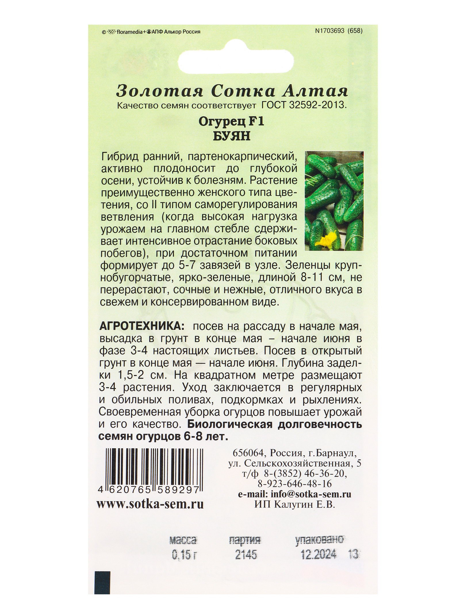 Семена Огурец Буян F1 огурец /Сотка/ 0.15г / партен. раннесп. 8-11см/*1500, Золотая Сотка Алтая, Россия