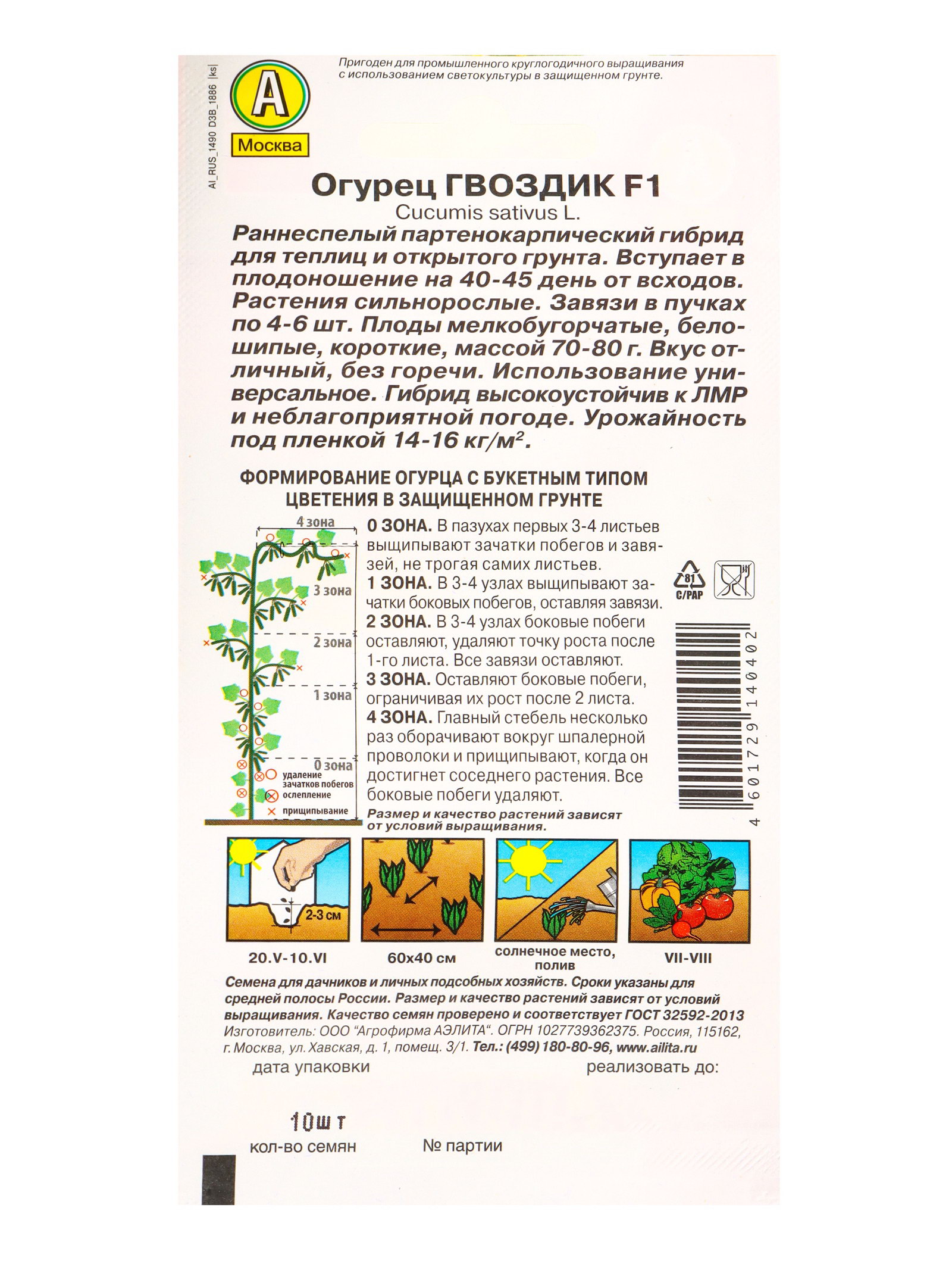 Семена Огурец Гвоздик F1 Парт, Ц/П,10 шт., Агрофирма АЭЛИТА, Россия