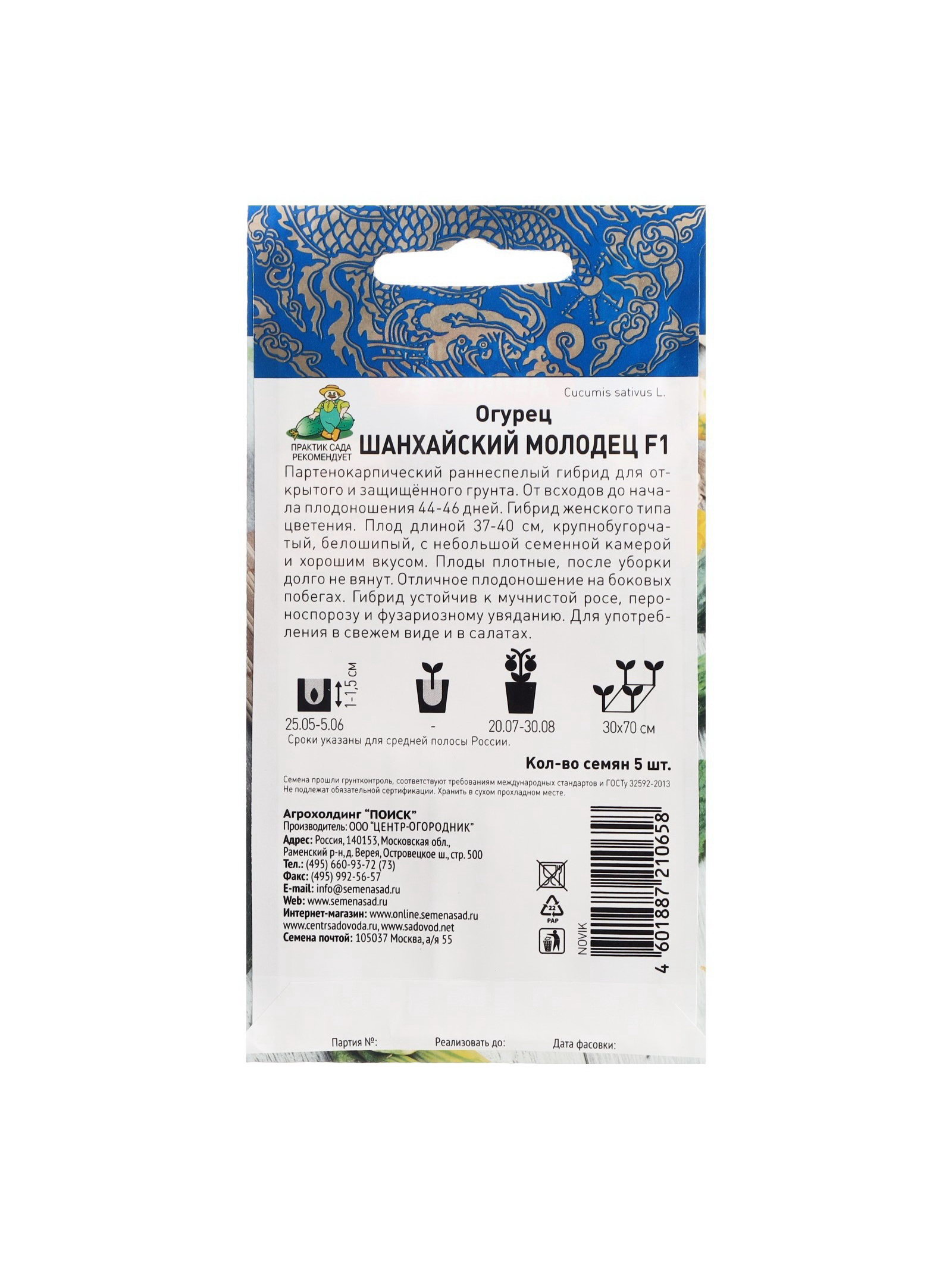 Набор семян Огурец "Шанхайский молодец" F1, партенокарпический, 5 шт., 9x17x1 см., Мой выбор, Россия