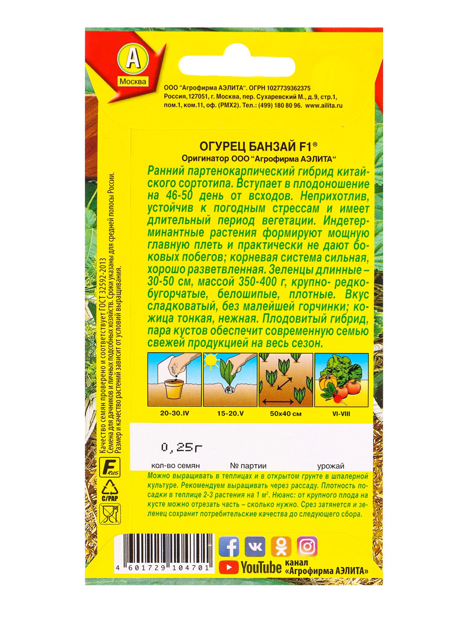 Семена Огурец Банзай F1 Парт, Ц/П,0.25 г, Агрофирма АЭЛИТА, Италия