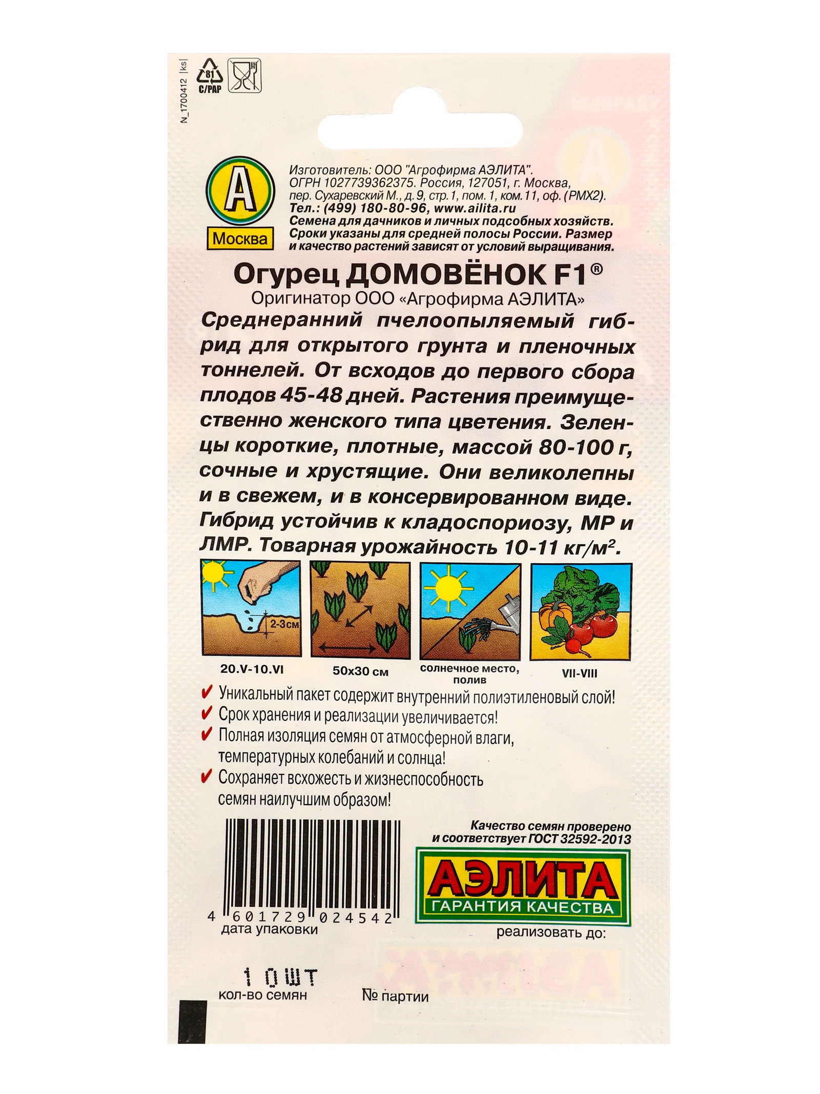 Семена Огурец "Домовенок", F1, пчелоопыляемый, 10 шт., Агрофирма АЭЛИТА, Италия