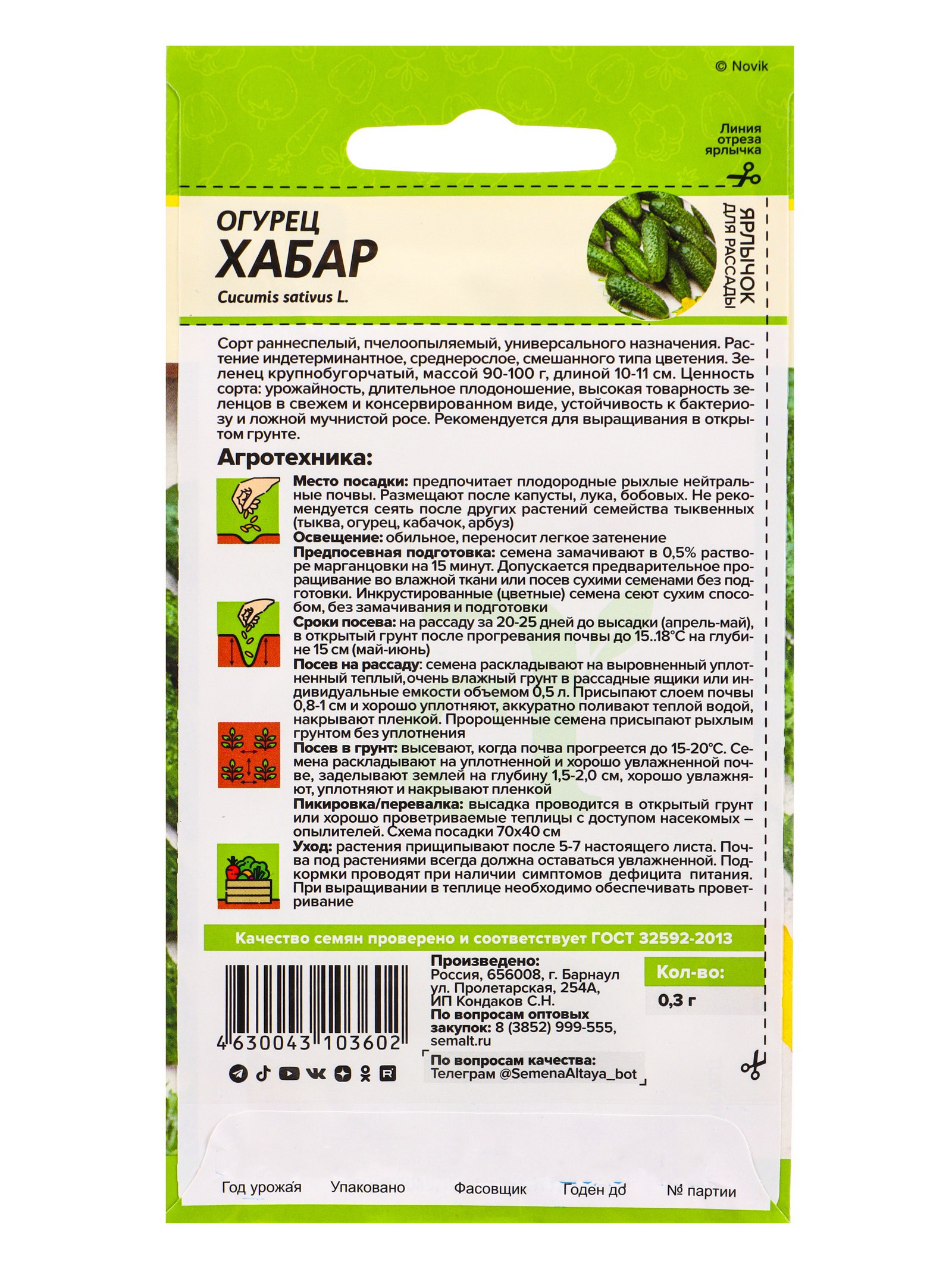 Семена Огурец "Хабар", 0.3 г, Семена Алтая, Россия