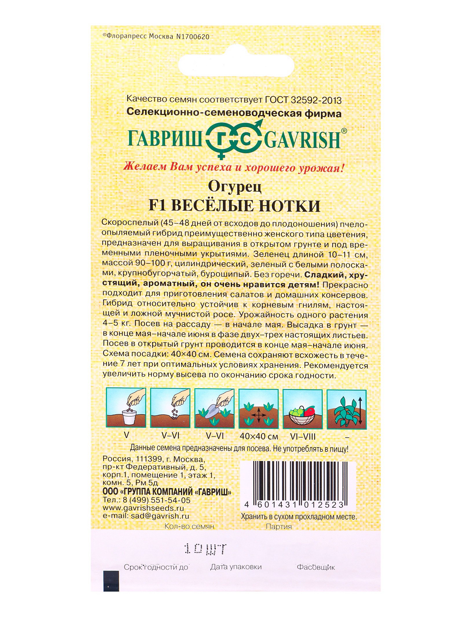 Семена Огурец Веселые нотки F1 10 шт. корнишон автор., Гавриш, Россия