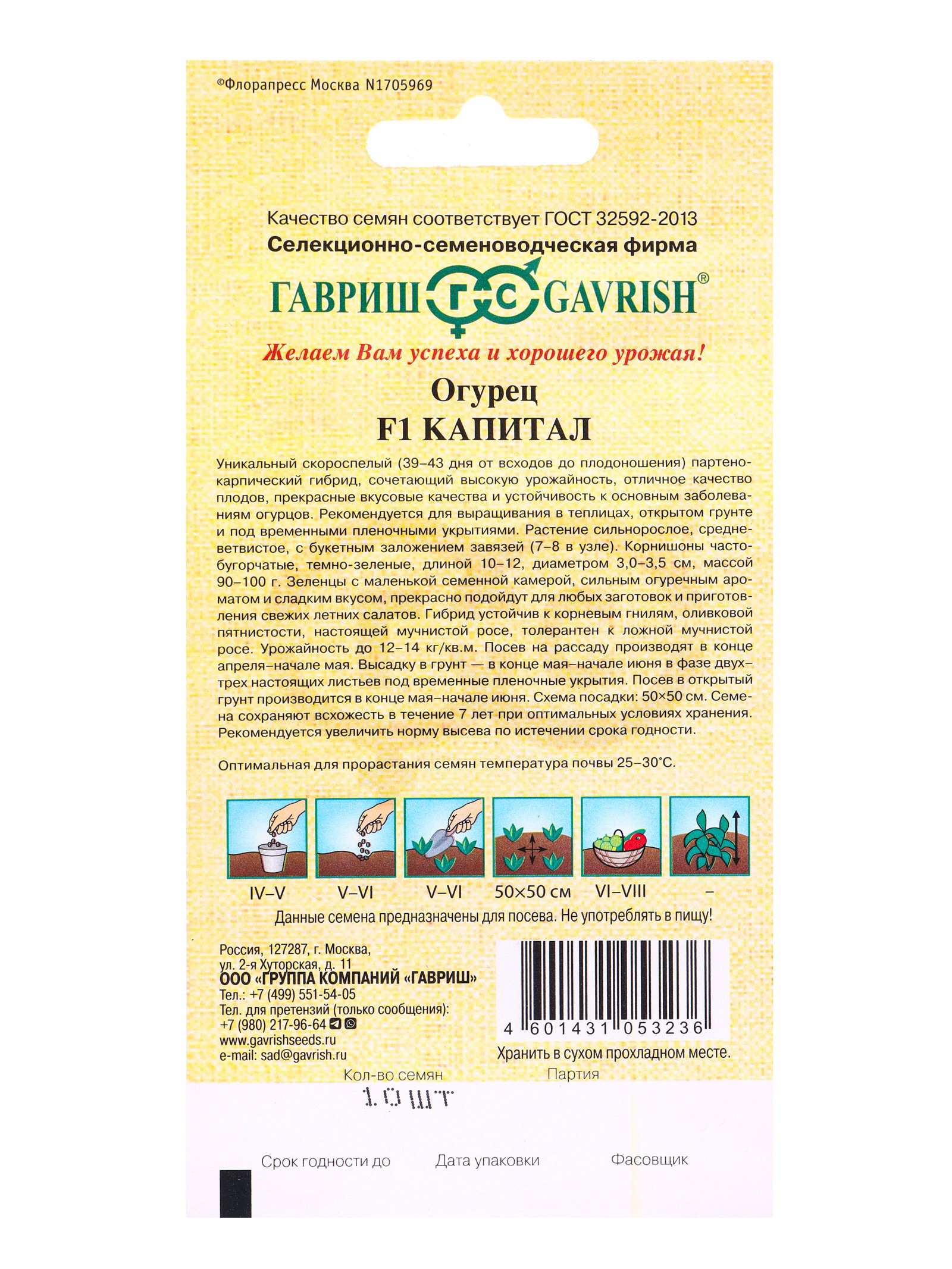 Семена Огурец Капитал F1 10 шт. автор., Гавриш, Россия