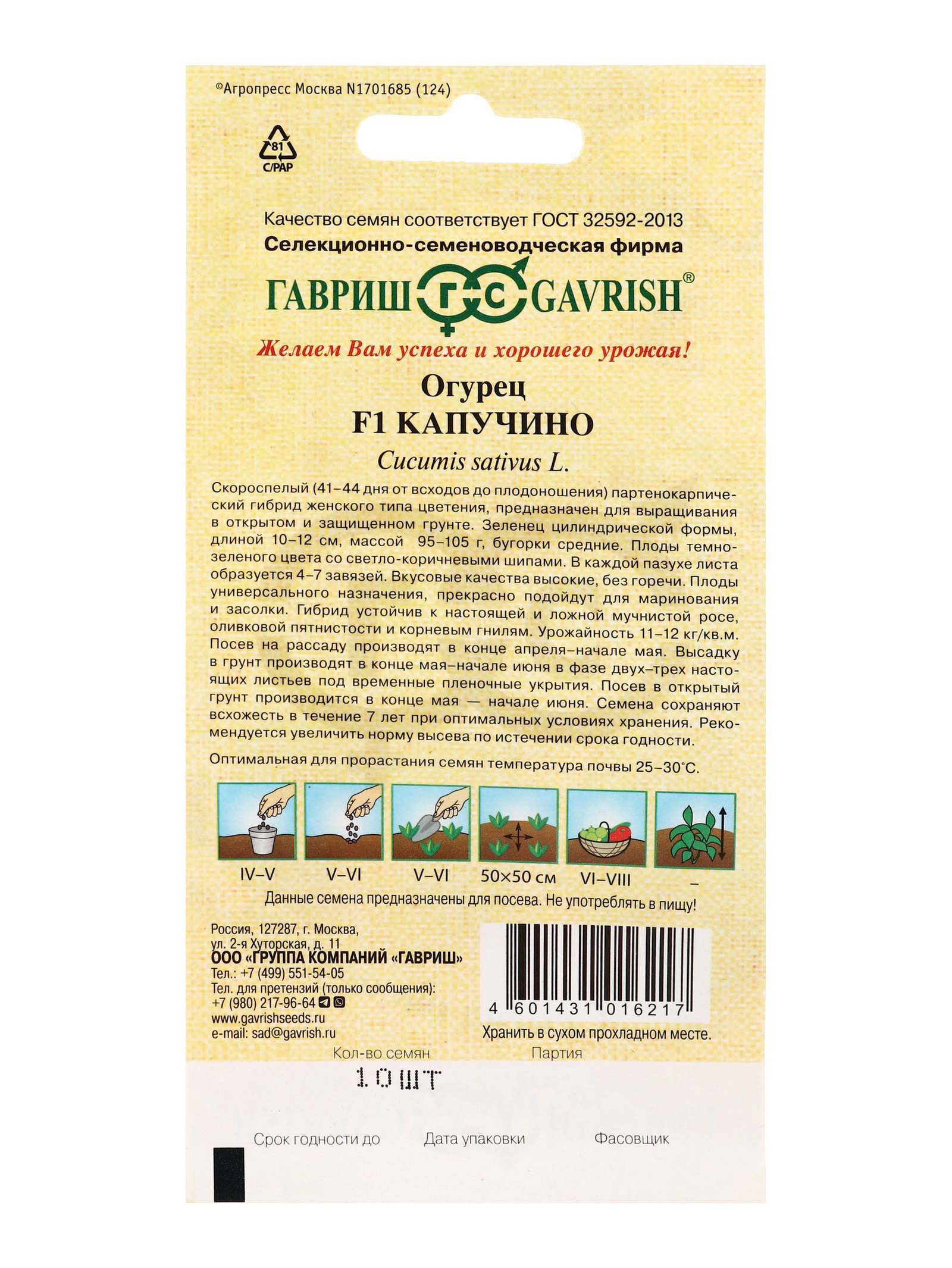 Семена Огурец Капучино F1 10 шт. корнишон автор., Гавриш, Россия