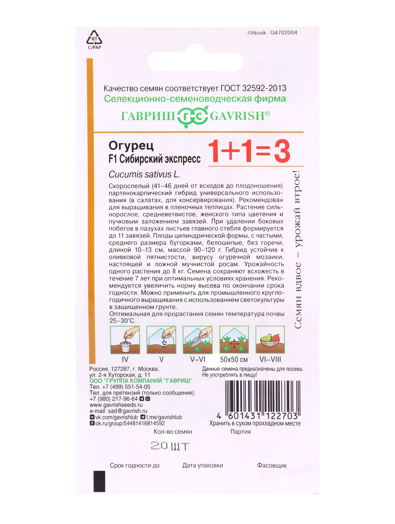 Семена Огурец Сибирский экспресс F1 серия 1+1/20 шт.автор., Гавриш, Россия