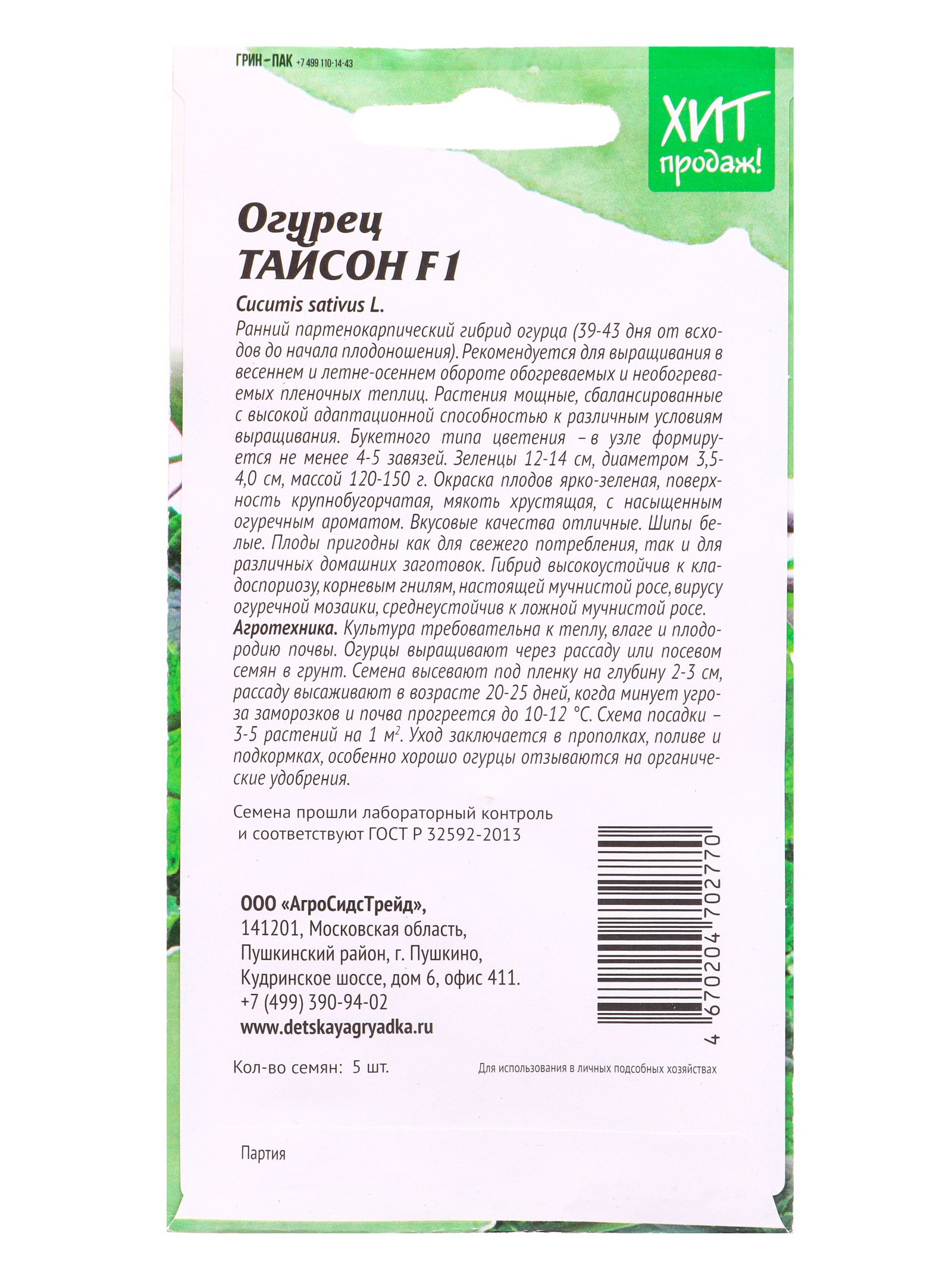 Семена Огурец Тайсон F1 5 шт, Агросидстрейд, Россия