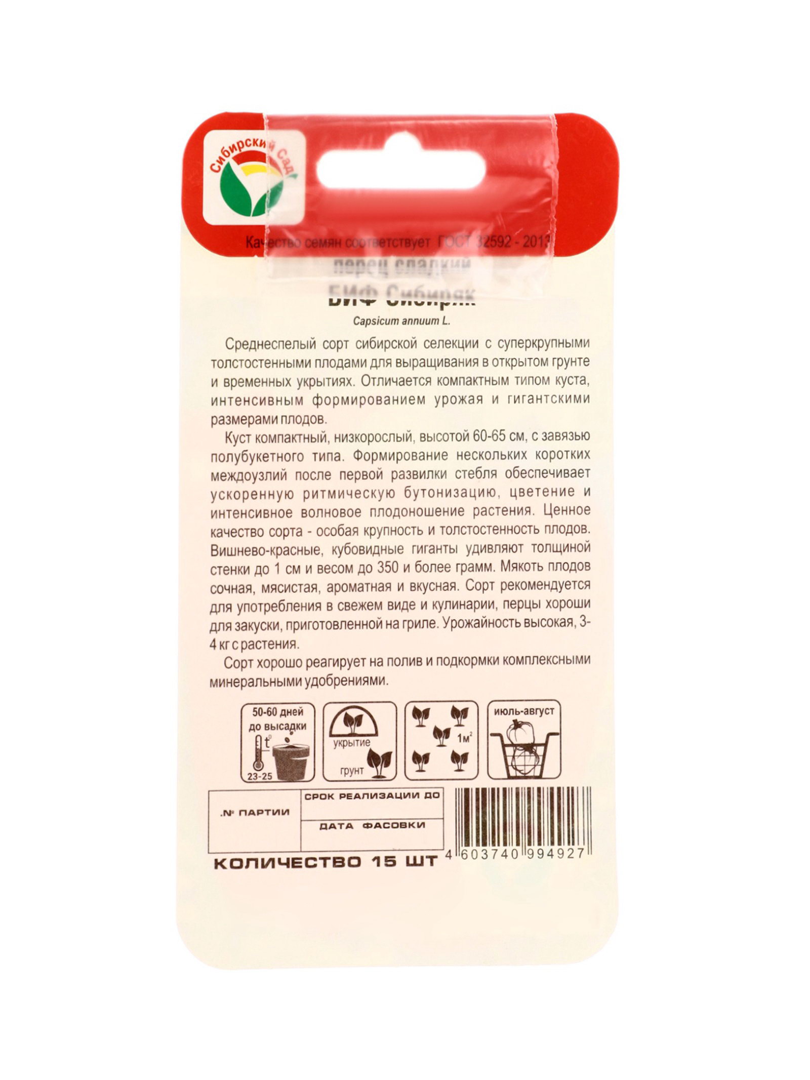 Размер упаковки: 8 x 0.1 x 15 см. tnved: 1209918000 Температурное ограничение: Нет Цвет: Красный Сроки созревания: Ранний Сорт или гибрид: Сорт Место выращивания: Универсальный Вкус: Сладкий Особо крупный, плоды до 350 гр Среднеспелый сорт сибирской селекции с супер крупными толстостенными плодами. Куст компактный, низкорослый, высотой 60-65см с завязью полубукетного типа. Вишнево-красные, кубовидные гиганты удивляют толщиной стенки до 1см и весом до 350 и более грамм. Мякоть плодов сочная, мясистая, ароматная и вкусная. Для открытого и закрытого грунта. | ||