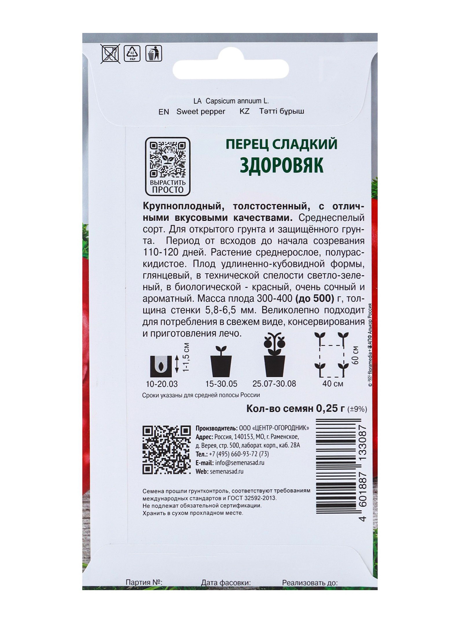 Размер упаковки: 8 x 0.2 x 15 см. tnved: 1209918000 tnved: 1209918000 Агрономический срок годности, лет: 3 Температурное ограничение: Нет Особенности выращивания: Универсальный Сорт или гибрид: Сорт Сроки созревания: Средний Вкус: Сладкий Цвет: Красный Крупноплодный, толстостенный с отличными вкусовыми качествами. Среднеспелый сорт. Для открытого грунта и пленочных теплиц. Период от всходов до начала созревания 110-120 дней. Растение среднерослое, полураскидистое. Плод удлиненно-кубовидной формы, глянцевый, в технической спелости светло-зеленый, в биологической - красный, очень сочный и ароматный. Масса плода 300-400 г (до 500 г), толщина стенки 5,8-6,5 мм Великолепно подходит для потребления в свежем виде, консервирования и приготовления лечо. | ||