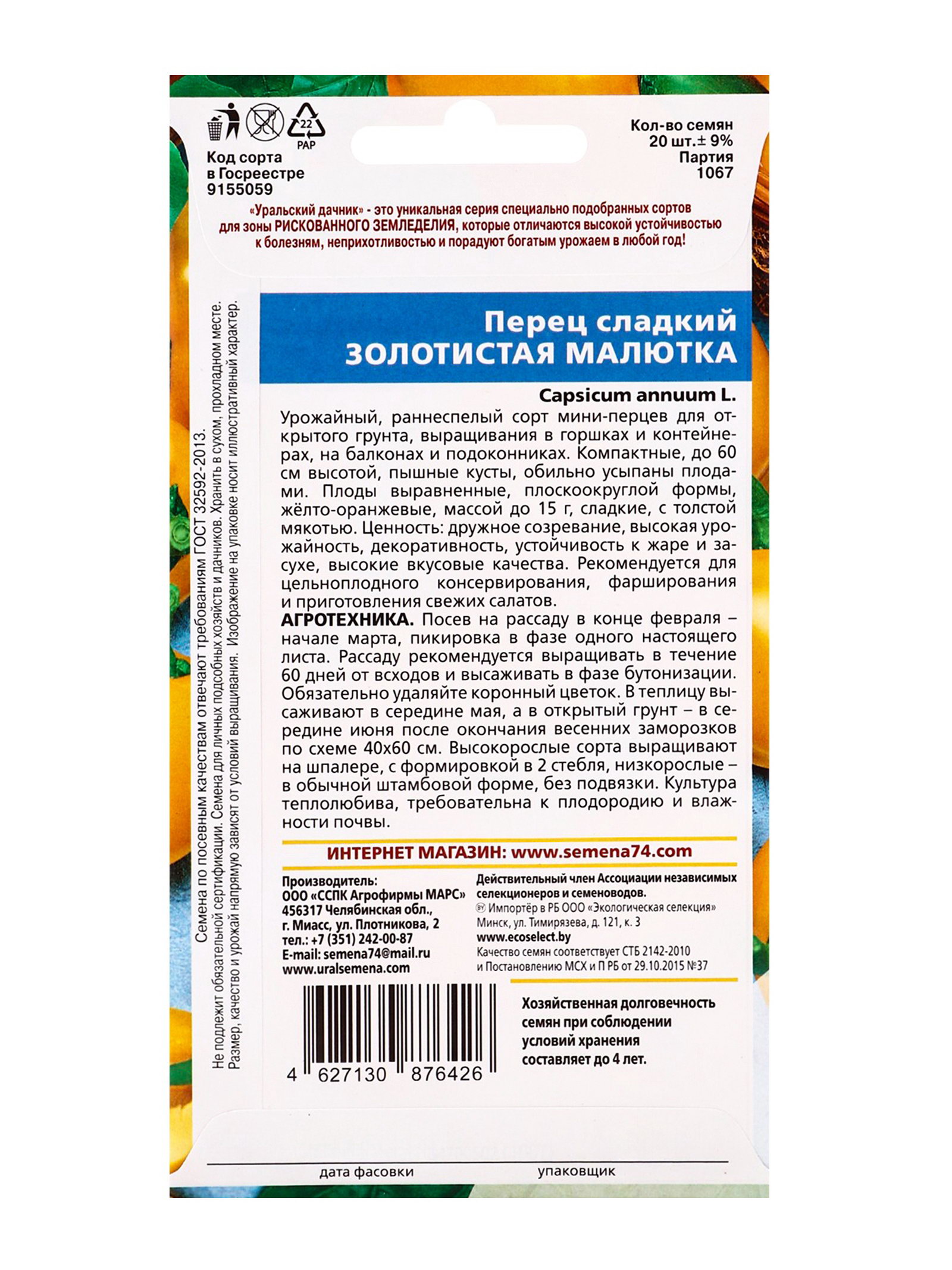 Семена Перец "Золотистая Малютка", 20 шт, Уральский Дачник, Россия