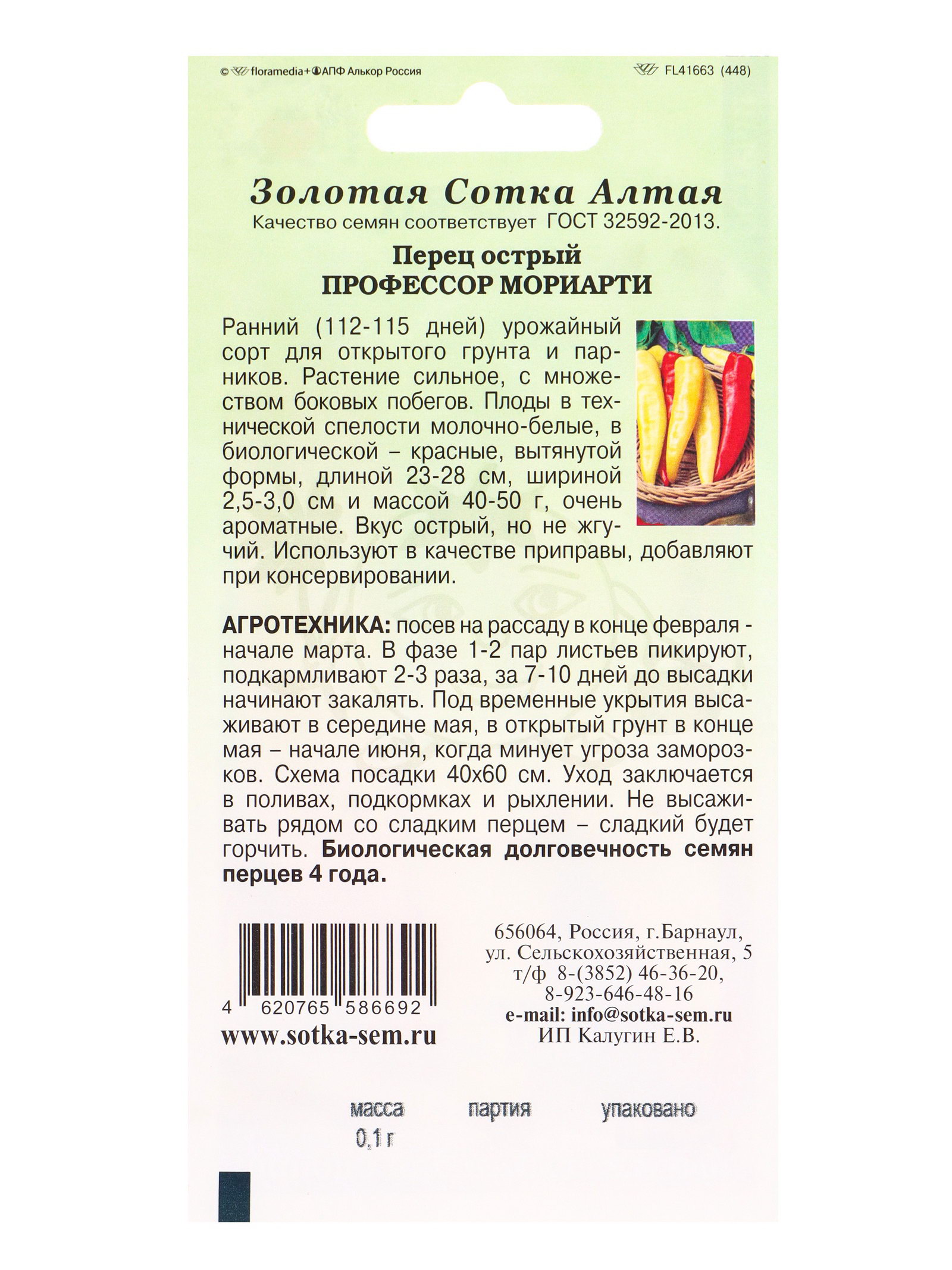 Семена Перец "Профессор Мориарти острый", 0.1 г, раннеспелый, "", Золотая Сотка Алтая, Россия
